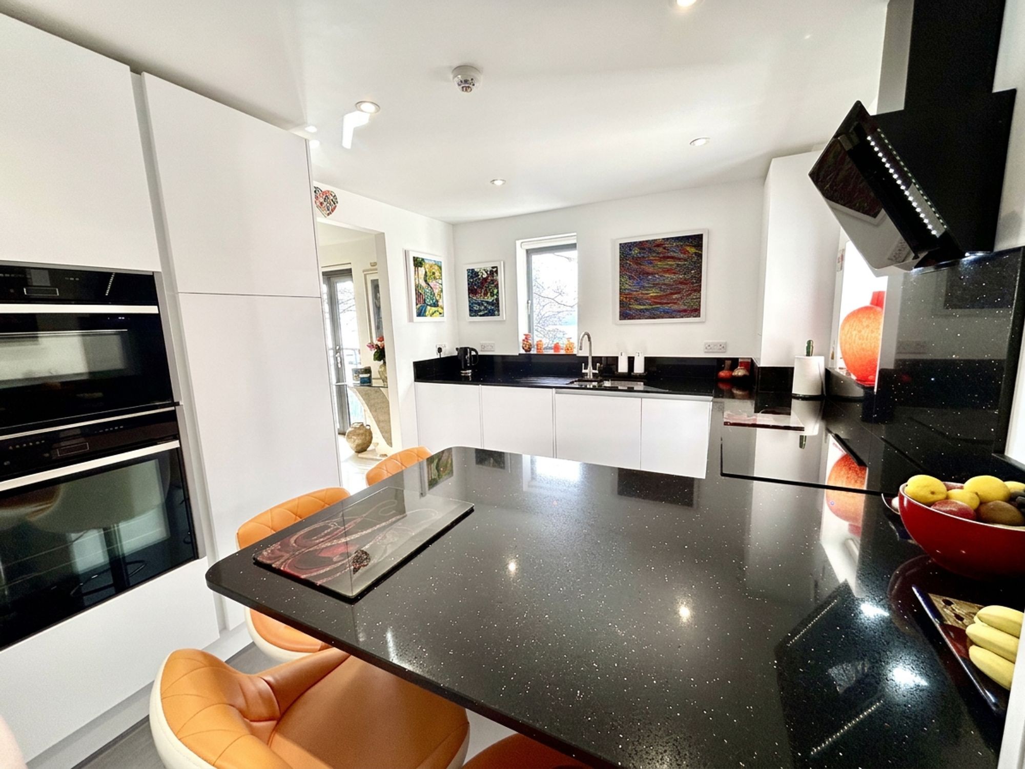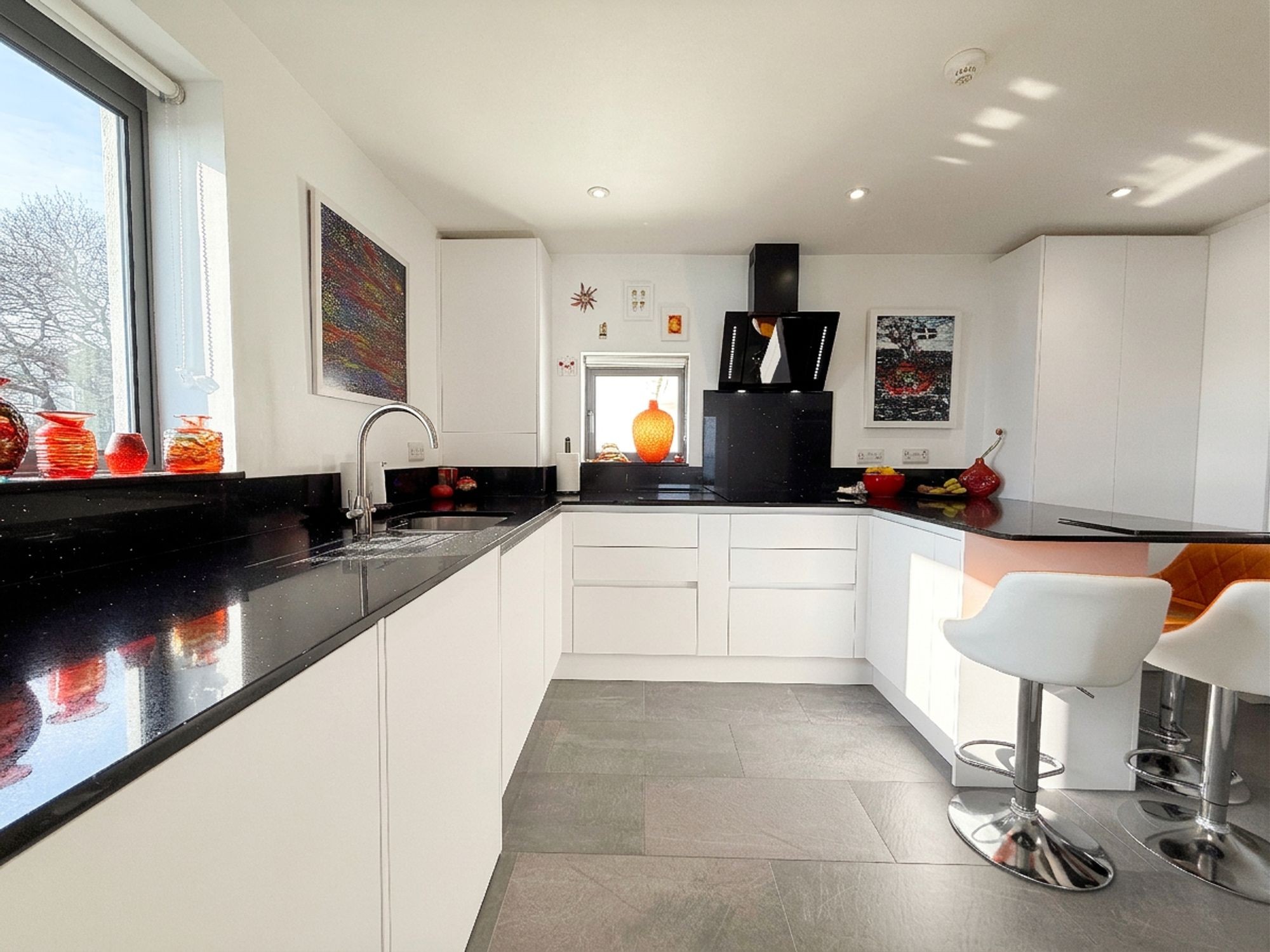 Stylish, beautifully appointed space installed in 2019: Flush matte white cupboards at base and eye level with extensive, quality Silestone composite worktops including a peninsula breakfast bar with views to sea and coast. Floor to ceiling cupboards, integrated 'NEFF' double oven with grill and microwave with slide and hide door. Corner carousels. Integrated washing machine and tumble dryer. Integrated fridge and freezer. Inset one and a half bowl stainless steel sink with rivened Silesone drainer. Mixer tap. Silestone splashback. Double glazed window to side with a sea view and to rear. An 'NEFF' induction hob. An extraction hood. Spotlit ceiling. Extraction. 'Villeroy and Boch' floor tiling. Silestone windowsills and upstands.