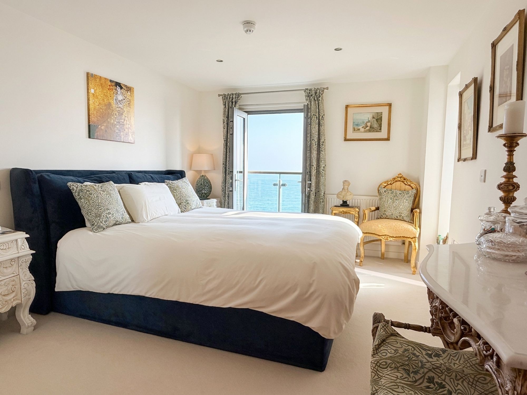 A wonderful sea facing master bedroom with double glazed French doors onto a Juliette balcony plus window to side looking to sea and coast. Radiator. Spotlit ceiling.