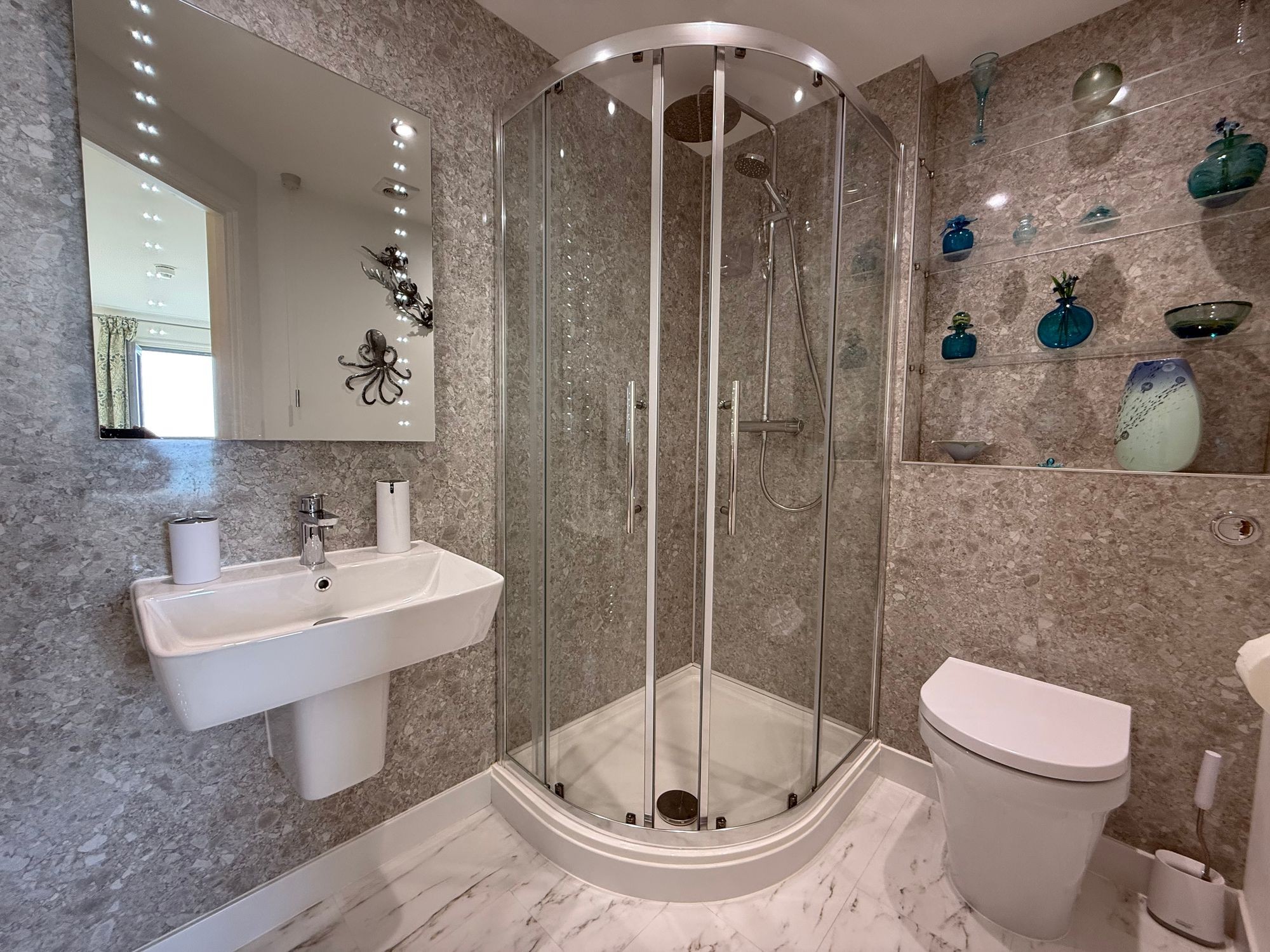 Stylish, spotlit room installed in 2023: corner cubicle with rain and flexible spray. Hand basin and WC with concealed cistern and dual flush. Chrome heated towel rail. Extractor. Sensor lit mirror.