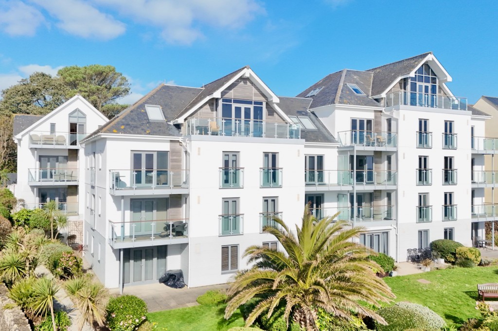 Spectacular second floor corner apartment in exclusive Falmouth seafront development with sea views, balcony, secure gated gardens, and direct access to coastal walks and town.