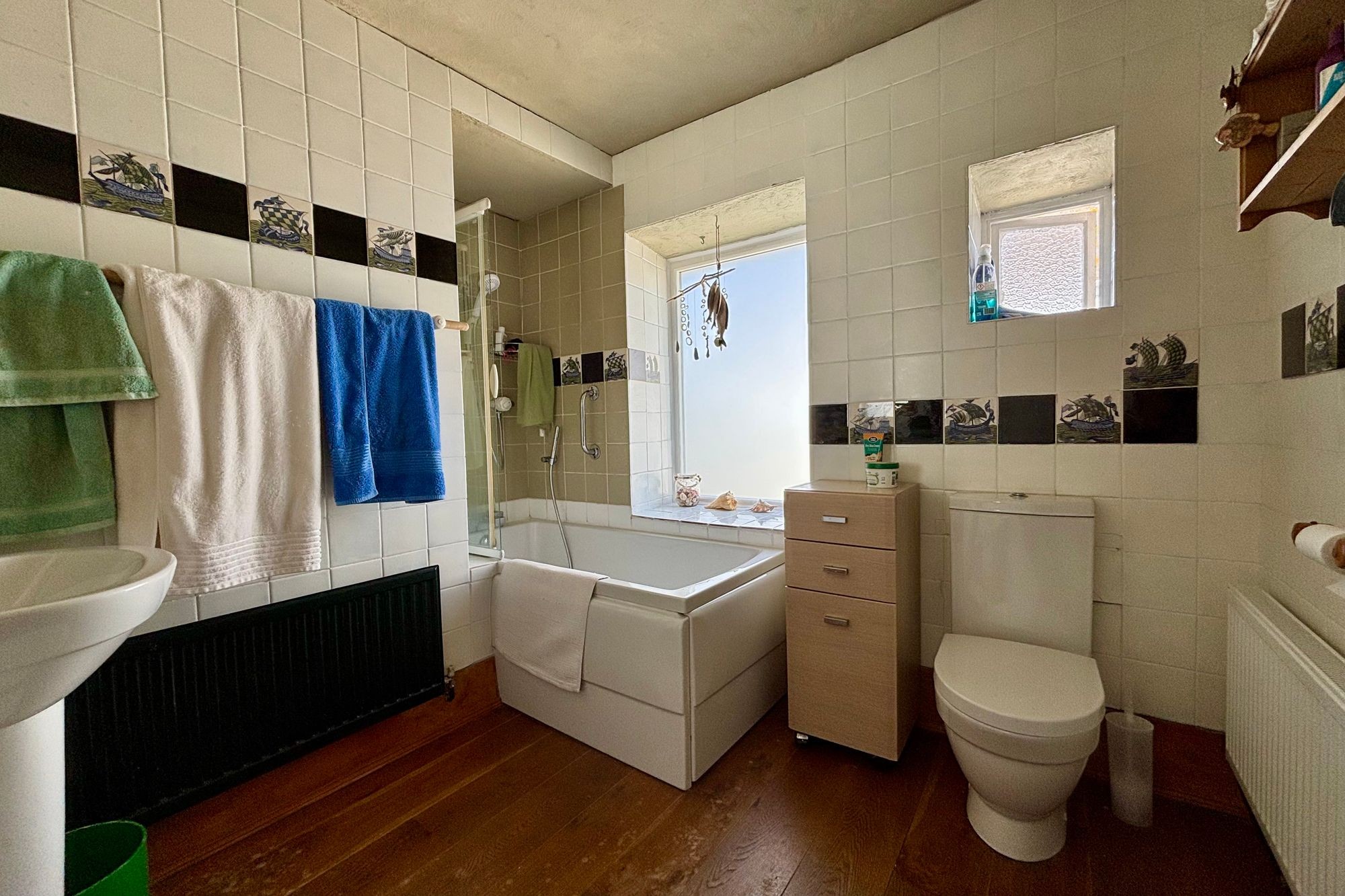 White suite comprising WC, bath with shower over and glass screen to the side and pedestal handwash basin, window to the rear, tiled walls, radiator