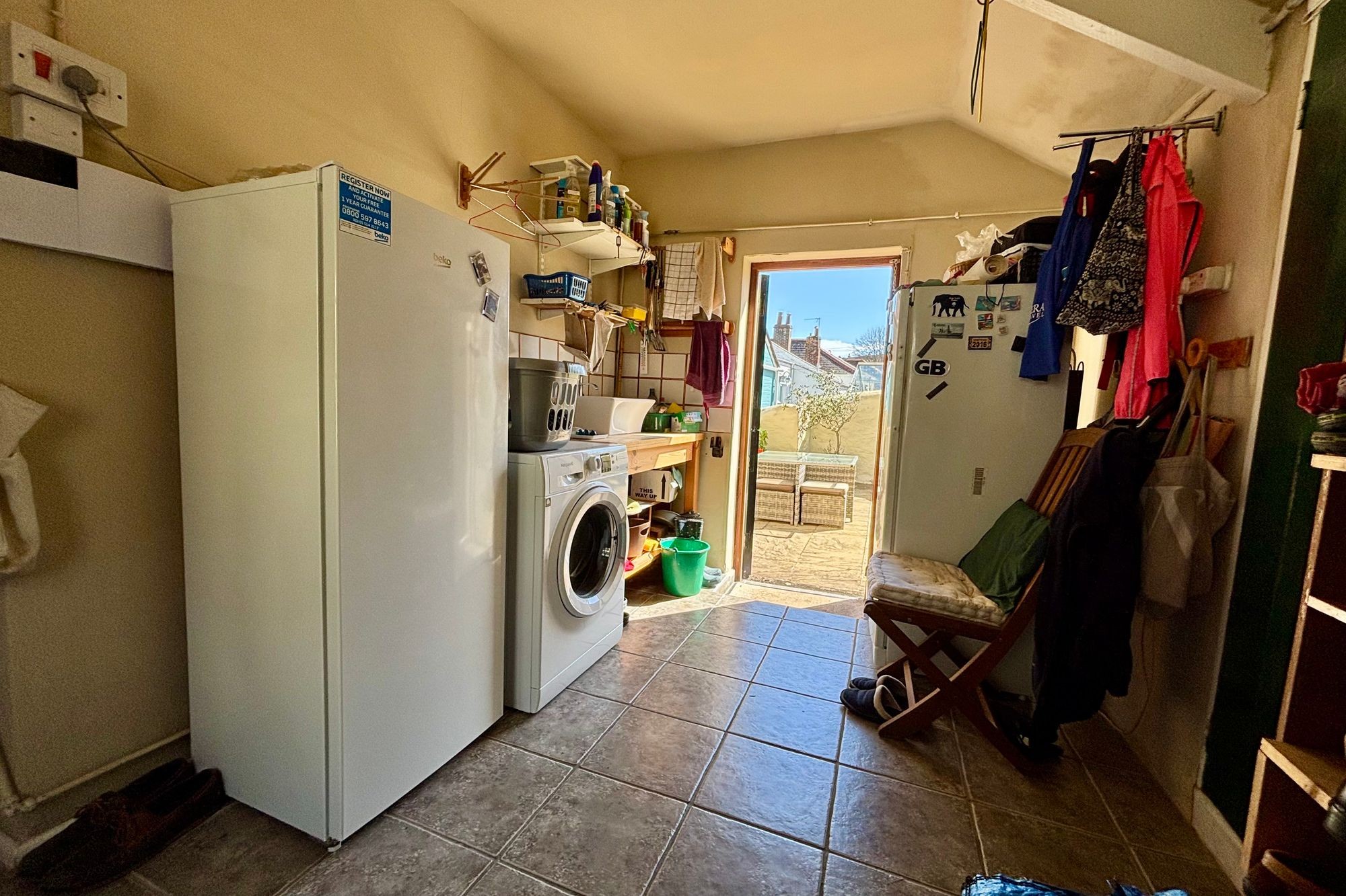 Doors leading to the rear garden on both sides, door to pantry and a further door to a WC. Tiled floor, sink unit and plumbing for washing machine.
