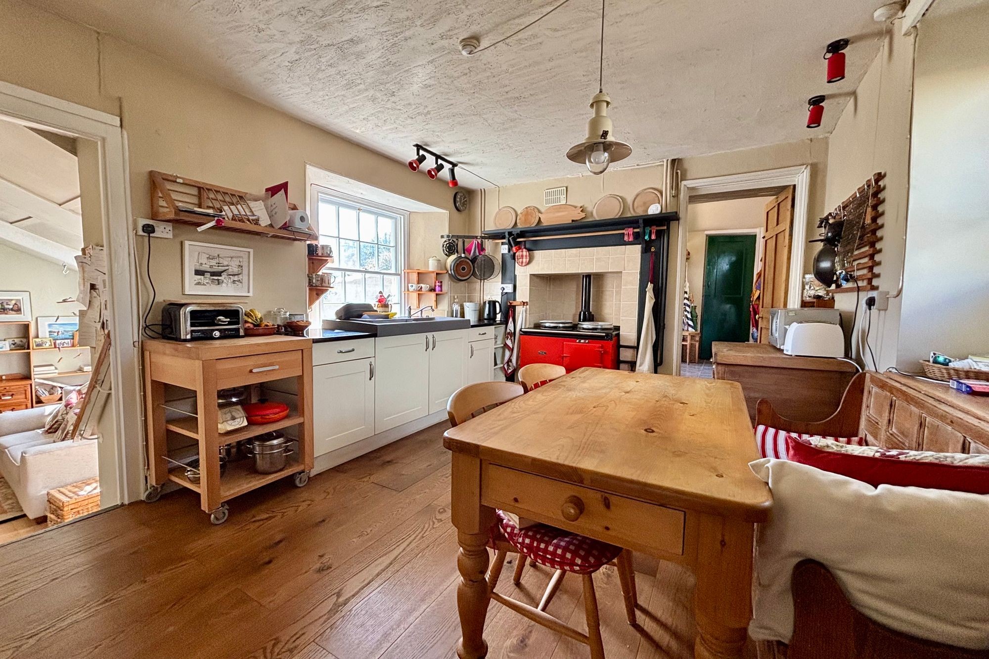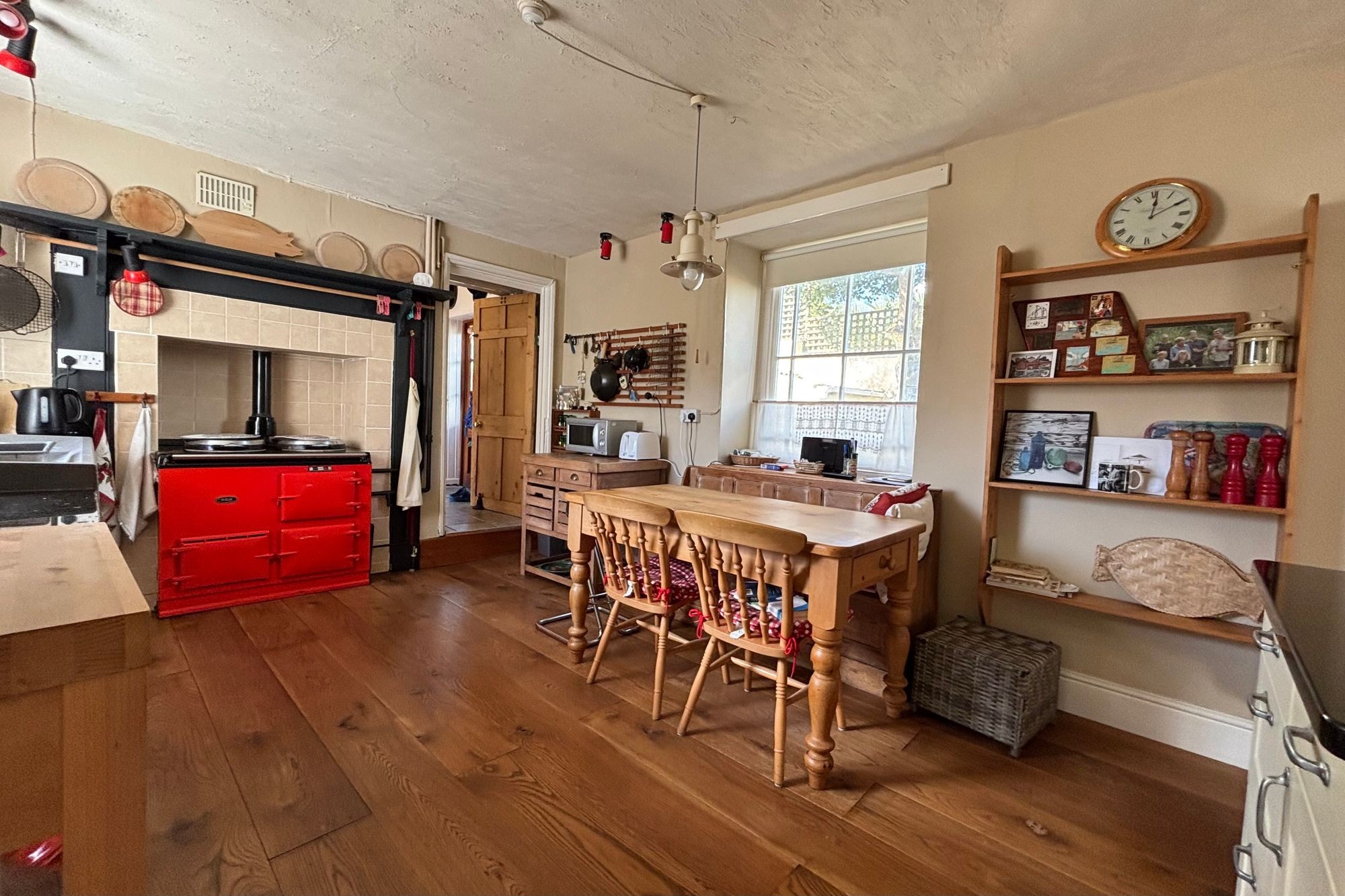 Range of white fronted base units with dark work top and a lovely, red, gas fired Aga. Wooden floor and space for dinning table and chairs. Windows on two sides with doorway through to…