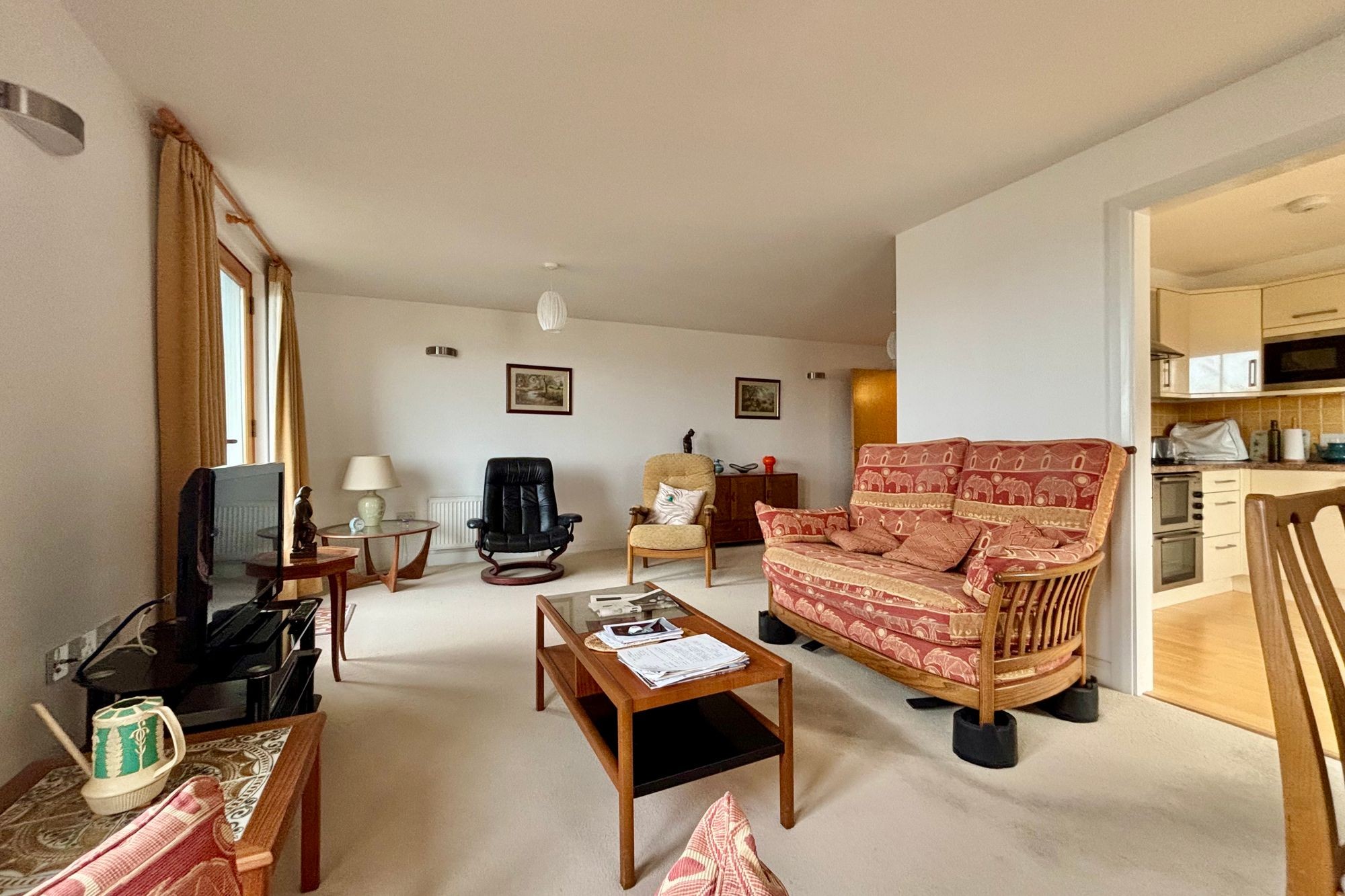 Of 'L' shape. A dual aspect, spacious room with window to side and two sets of French doors, one to a Juliette balcony the other on to a full balcony, providing some fine and interesting views over Events Square and the Maritime Museum and Docks, into Falmouth harbour. this expansive view looks along Falmouth's waterfront towards The Greenbank Hotel and Penryn River and across to Flushing and Trefusis Point and into The Carrick Roads, across to St. Just in Roseland and the Roseland Peninsula. Two radiators. Semi-circular and pendant lights. Square archway to kitchen.