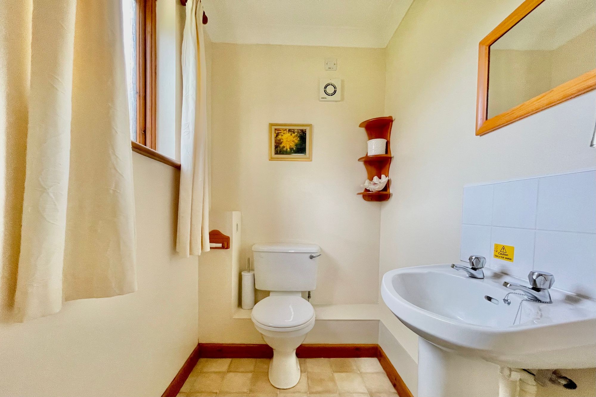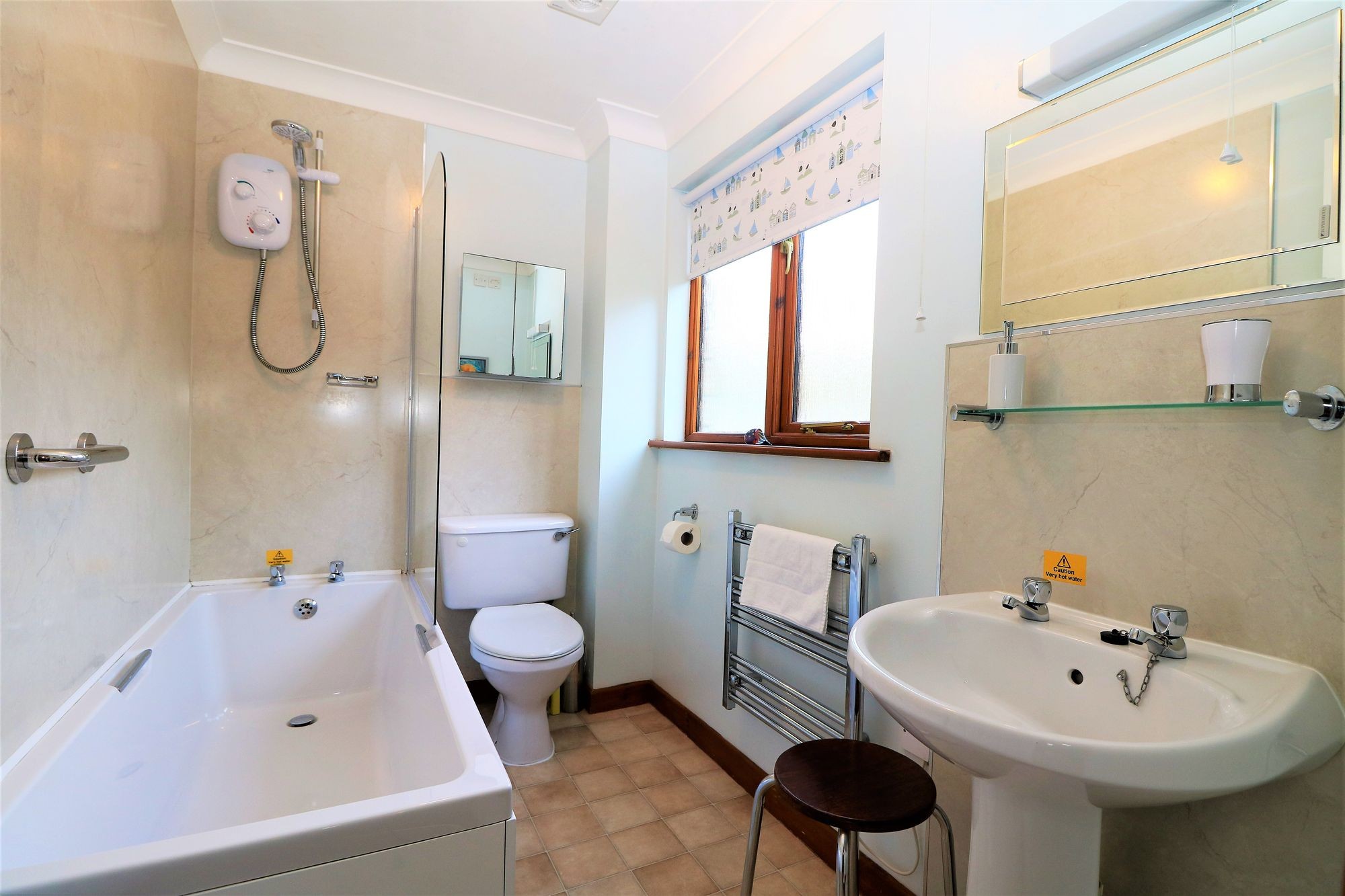 Recently fitted with a white three piece suite comprising panelled bath with instant shower over, WC and pedestal wash basin, light and shaver point over. Chrome heated towel rail. Wipe clean wall panelling. Opaque double glazed window to rear. Extractor fan.