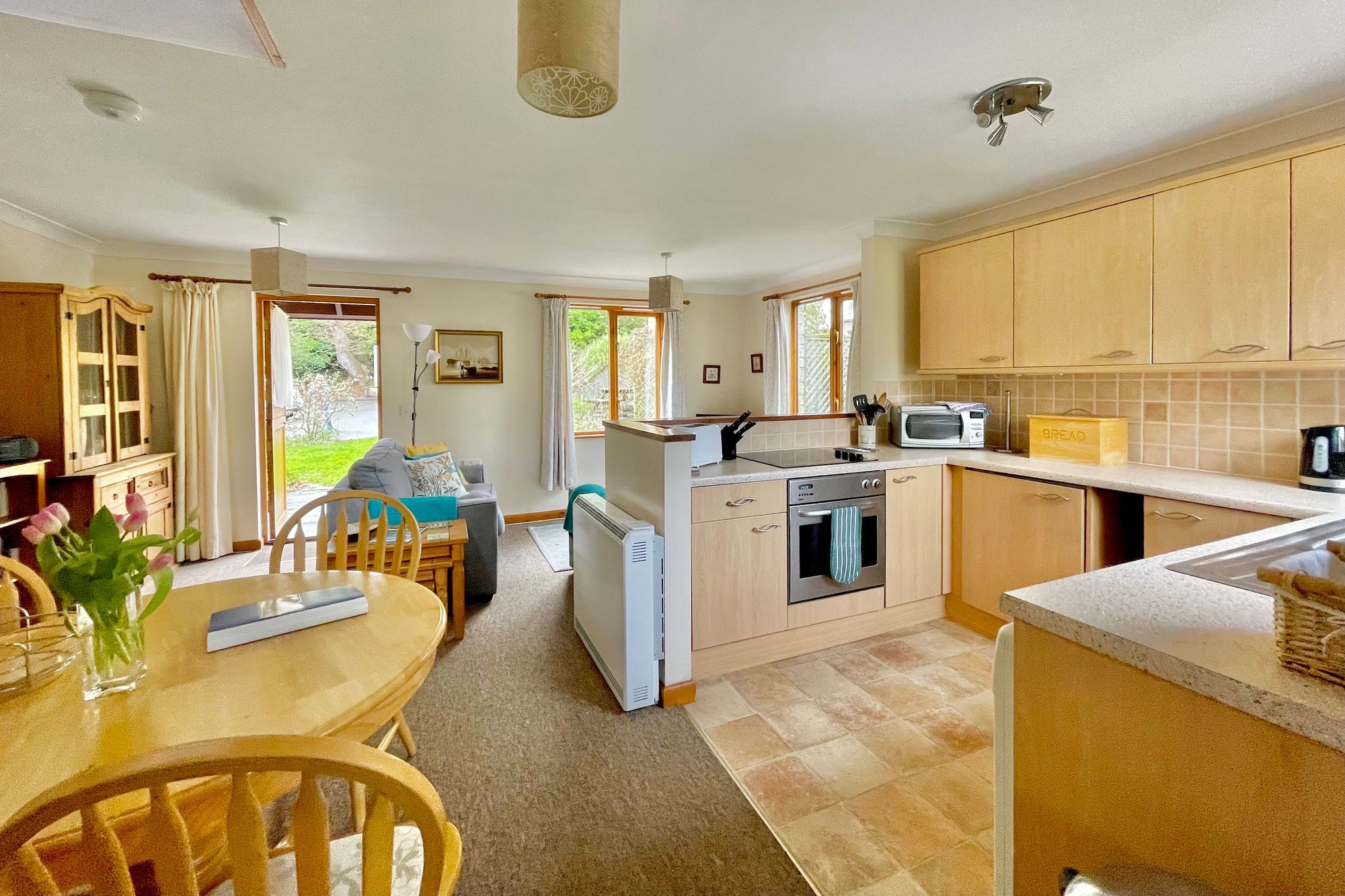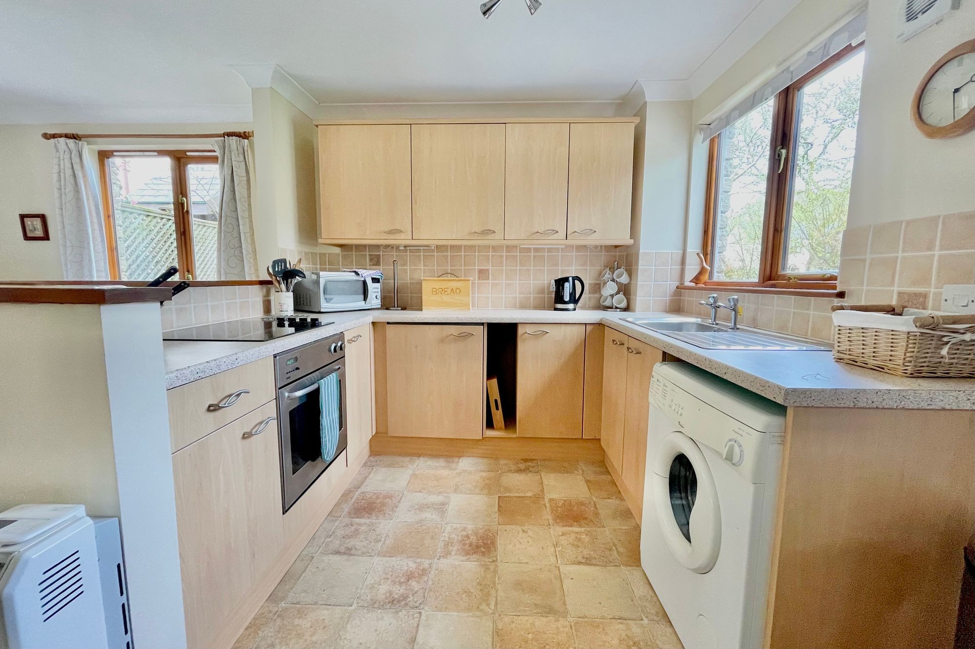 17' x 16' 9" (5.18m x 5.11m) (plus 5' 4" (1.63m) open vestibule). Fitted kitchen area comprising stainless steel single drainer sink unit with a range of base and wall cupboards. Fitted roll edge work tops with inset electric ceramic hob and built-in electric oven under. Washing machine. Complimentary wall tiling. Extractor fan. Window overlooking stream and communal gardens. Full fibre internet connected to the property and BT Broadband checker showing speeds up to 900mb/s. Fire extinguisher and fire checks completed including new locks, fireproofing and fire alarms 2024. EICR electrical test and PAT testing completed 2024.