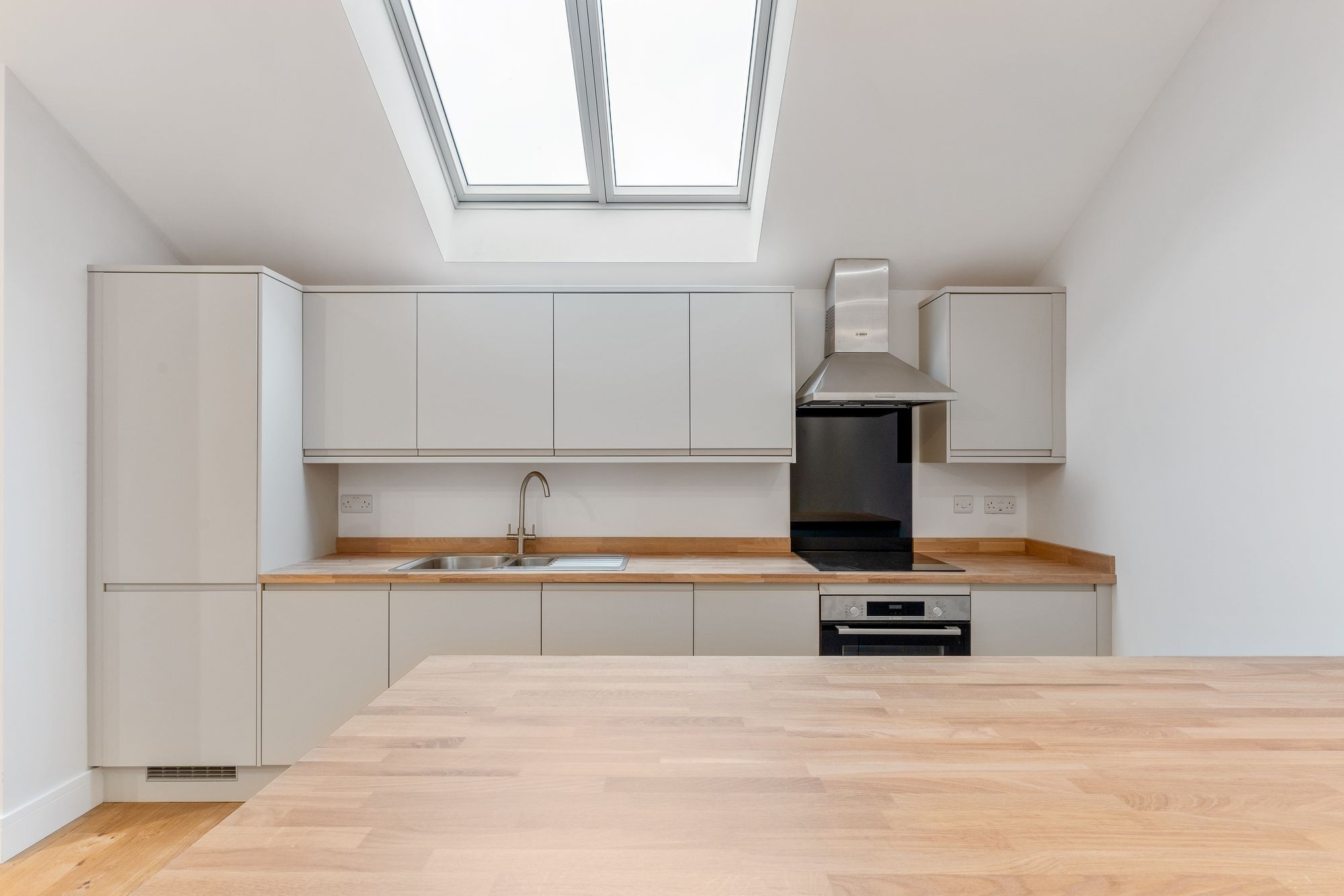 (KITCHEN/DINING/LIVING) Open plan living area with Juliet balcony overlooking landscaped gardens to the front. A fitted and well-equipped kitchen with wall and base units finished in a Clerkenwell Sandstone and oak worktop surfaces including the kitchen breakfast bar. Integrated Bosch appliances include an integral oven with an induction hob and a stainless-steel extractor hood over, slimline dishwasher and fridge. Stainless steel sink with swan neck mixer tap and drainer. The breakfast bar provides fitted units to one side for further storage and bar stool space to the other creating a practical and sociable environment. The sitting and dining room space offers flexibility enjoying plenty of natural light with a skylight above and a double-glazed window to the front offering a similar outlook as the Juliet balcony. Large double oak doors provide access to further storage space.