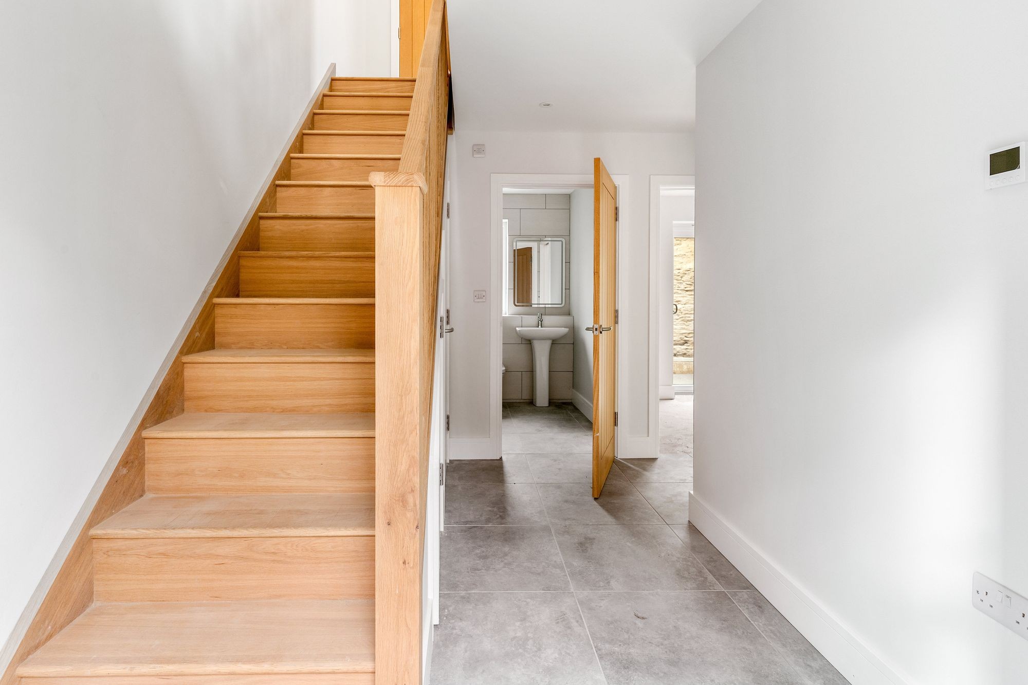 A large entrance with a composite glazed triple lock front door. Porcelain tiled flooring with underfloor heating throughout the ground floor, wooden oak doors accessing the two bedrooms, Jack & Jill bathroom and an Oak staircase rising to the first-floor open plan living area. A spacious understairs storage area housing the modern hot water immersion tank. Thermostat controls.