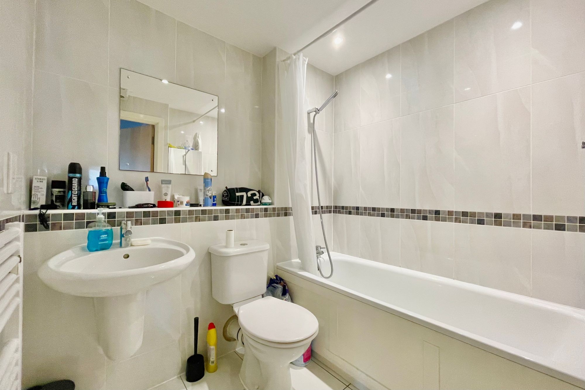 A modern white three-piece suite comprising button flush WC, wall mounted hand basin and panel bath with tiled surround and shower mixer over. Mirrored medicine cabinet. Tiled floor. Shelving. Heated towel radiator. Extractor.