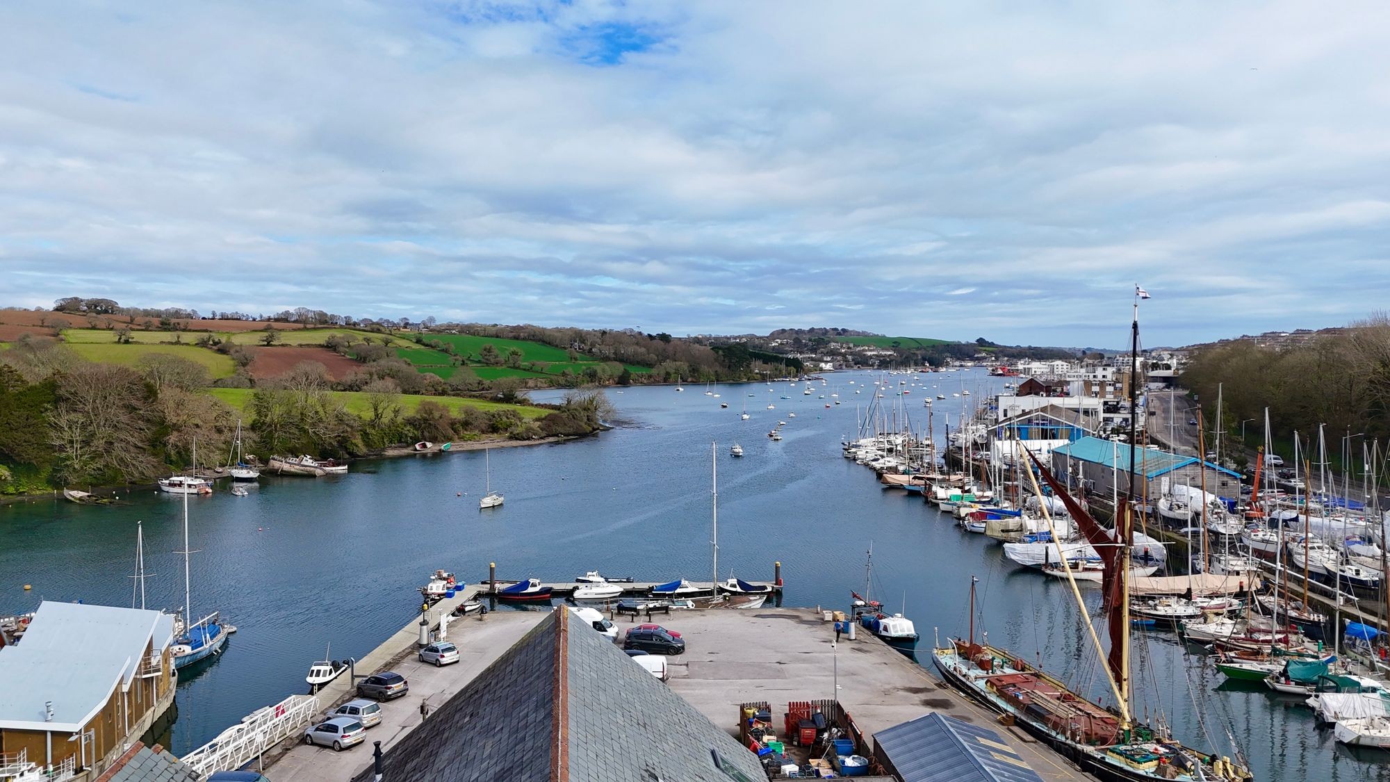 Large balcony with stainless steel rails and glazed screens providing an absorbing outlook over Penryn River, towards Trevissome and Flushing. A great feature flooding light into and accessed from the open plan living area.
