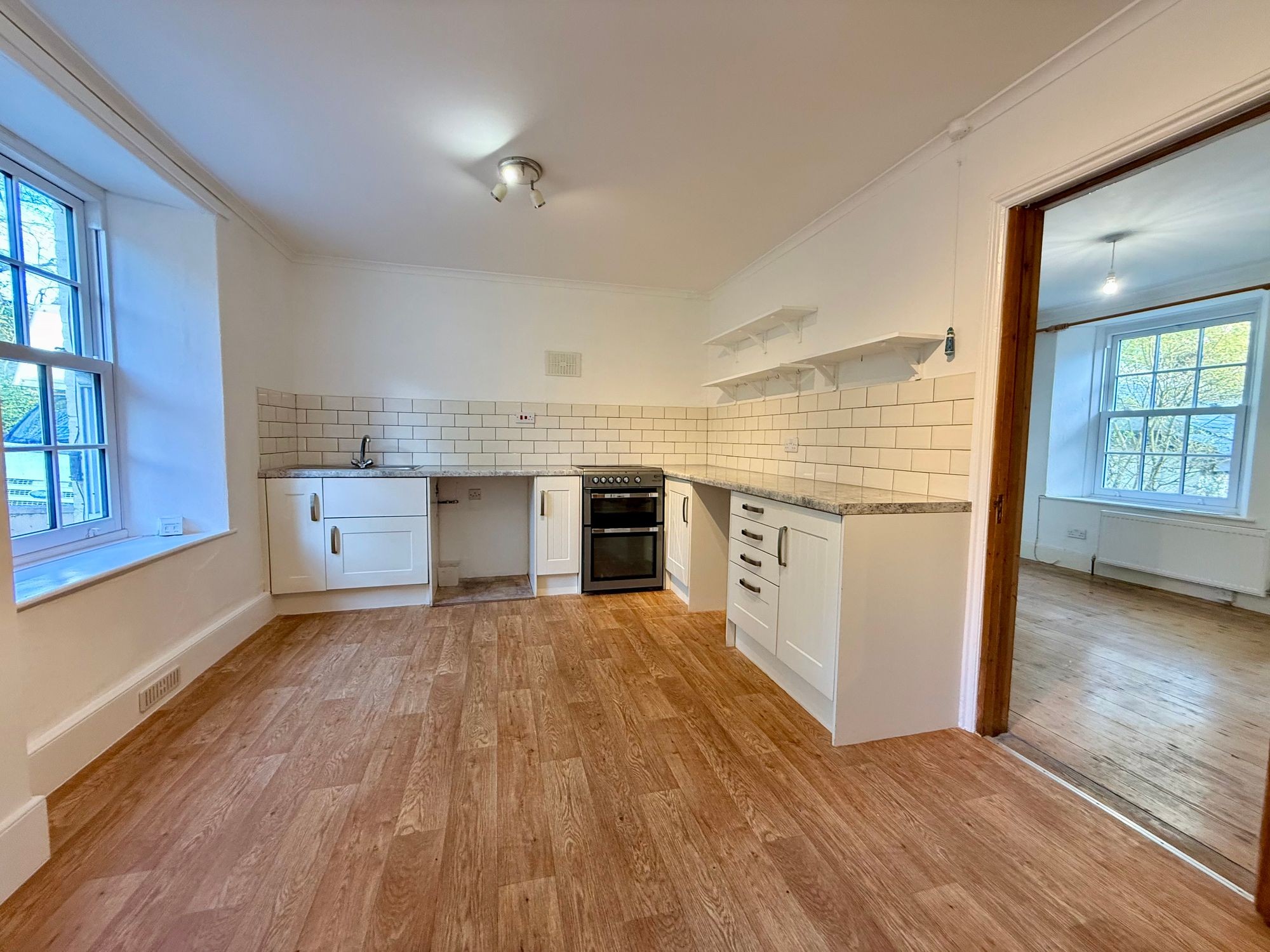 UPVC double glazed multipane sliding sash style window to front. A contemporary white, panel effect range of base cupboards and drawers, roll top work surfaces and inset stainless steel sink and drainer with mixer tap. Cream tile splashback. Space and plumbing for washing machine. Space for fridge. Open shelves. Radiator. Electric meter cupboard. Wooden effect flooring. Ceiling spotlights. Glazed and panelled door to.....