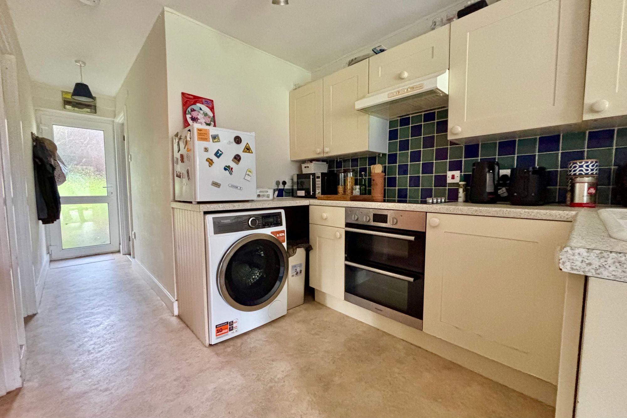 Fitted cream base and eye-level cupboards with laminate roll top work surfaces and an inset one-and-a-half bowl sink with mixer tap. Inset halogen hob. Tiled splashback. Stainless steel double oven and grill with extraction hood. Integrated fridge. Space for a washing machine.