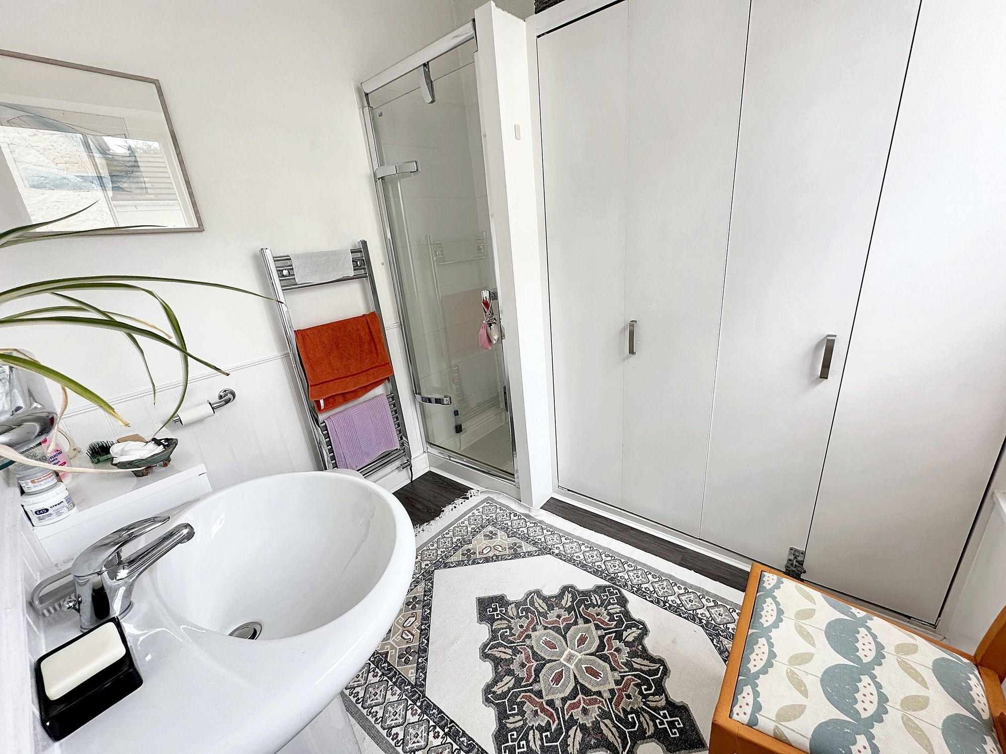 EN-SUITE 8' 9" x 7' 4" (2.67m x 2.25m) What a luxury to have such a large en-suite in a cottage in Flushing! Sash window to front aspect with window bench and hidden storage integrated. Laminate flooring, heated towel rail, lighting, large storage cupboards, and extractor. Three-piece white suite; low-level flush WC, large Gala pedestal wash basin and shower cubicle with tiled surround and glazed opening door.