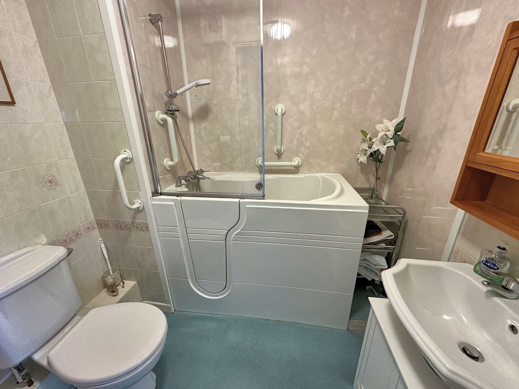 Refitted room in white comprising low flush WC, wash hand basin and over sized walk-in 'Mercury' shower/bath with seat. Heated towel rail, extraction fan, full ceramic wall tiling.