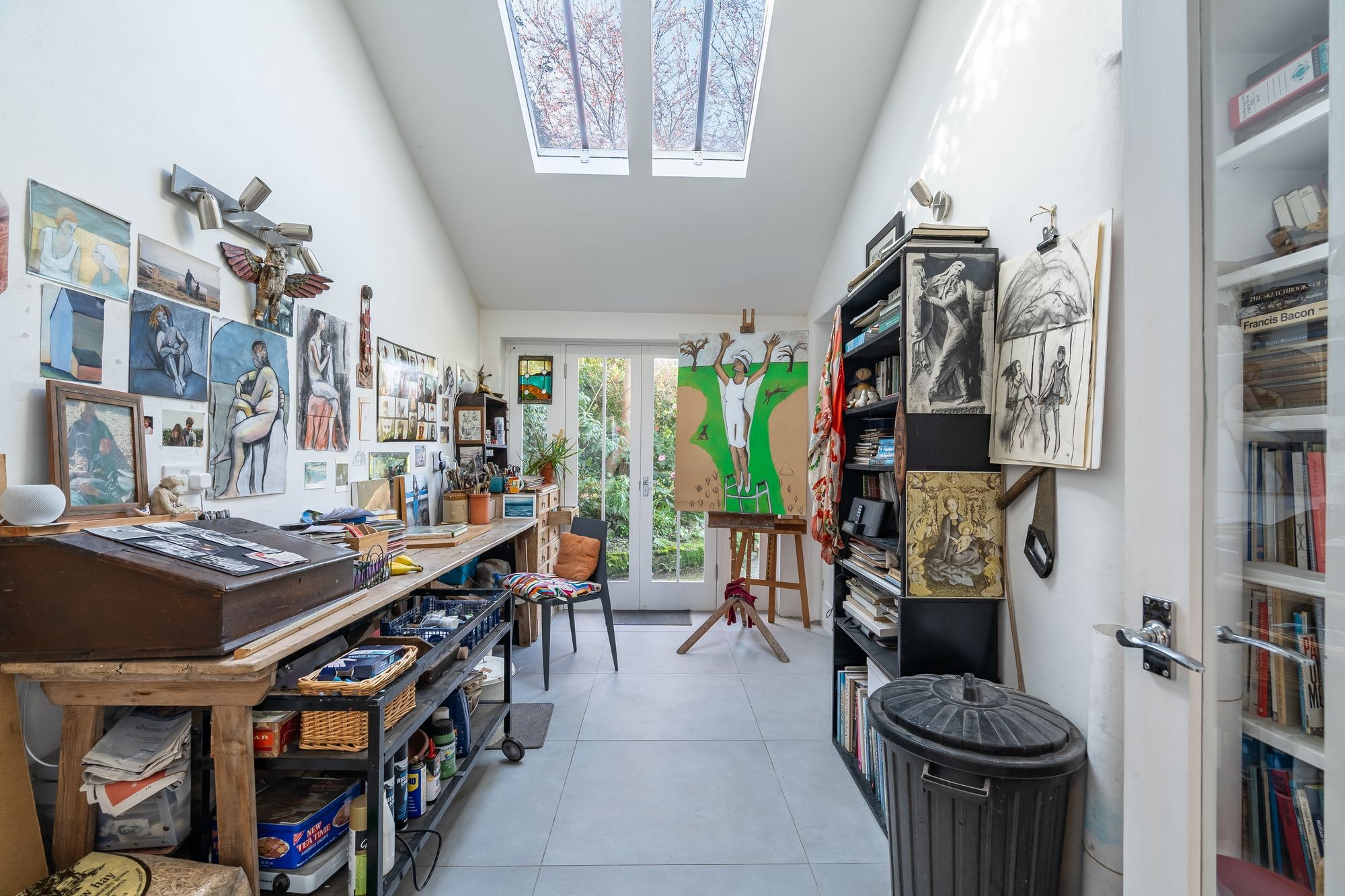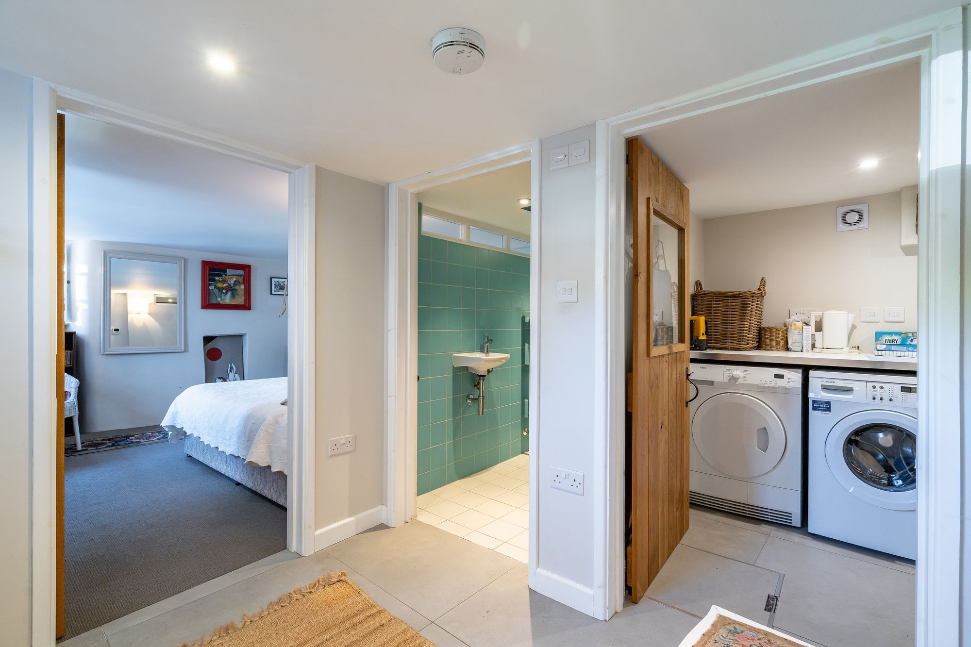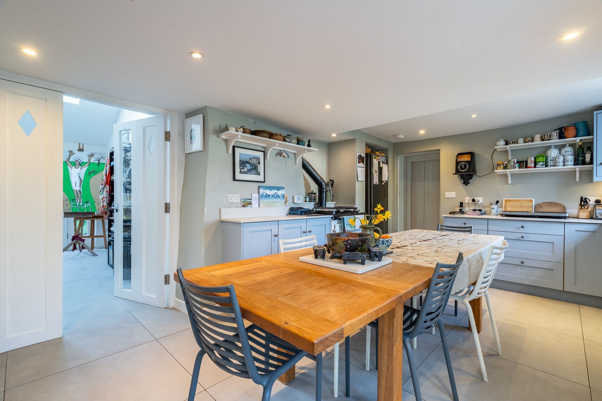 Continuation of tile floor. Door to shelved pantry/store. Sliding door to left into kitchen, to studio and beyond and door to right, into study/bedroom and glazed and panelled door ahead to…
