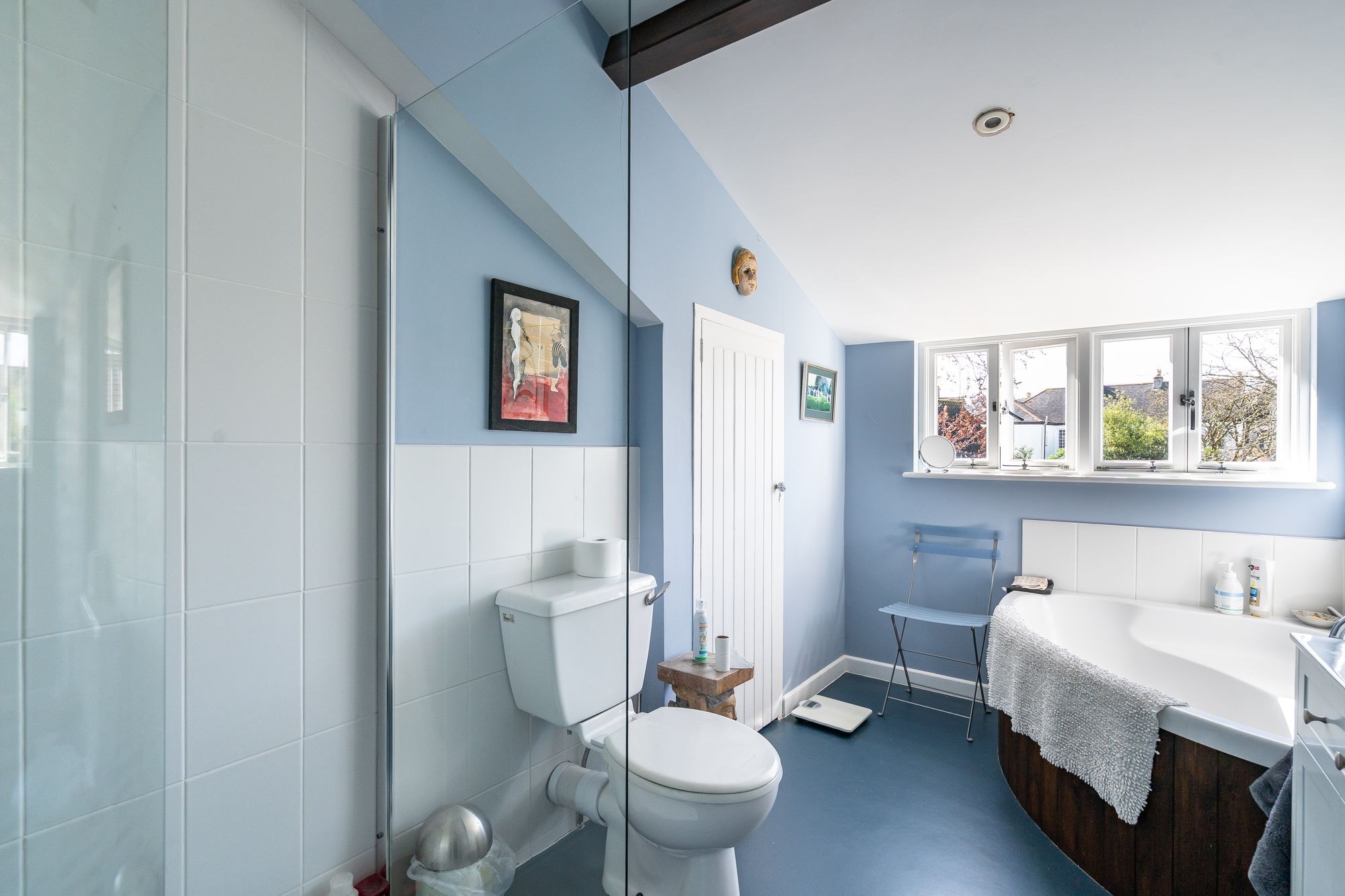 Skylight. White three-piece suite comprising WC, porcelain hand basin with cupboard beneath. Walk-in tiled boiler fed shower cubicle, curve glass screen. Chrome heated towel radiator. Medicine cabinet.