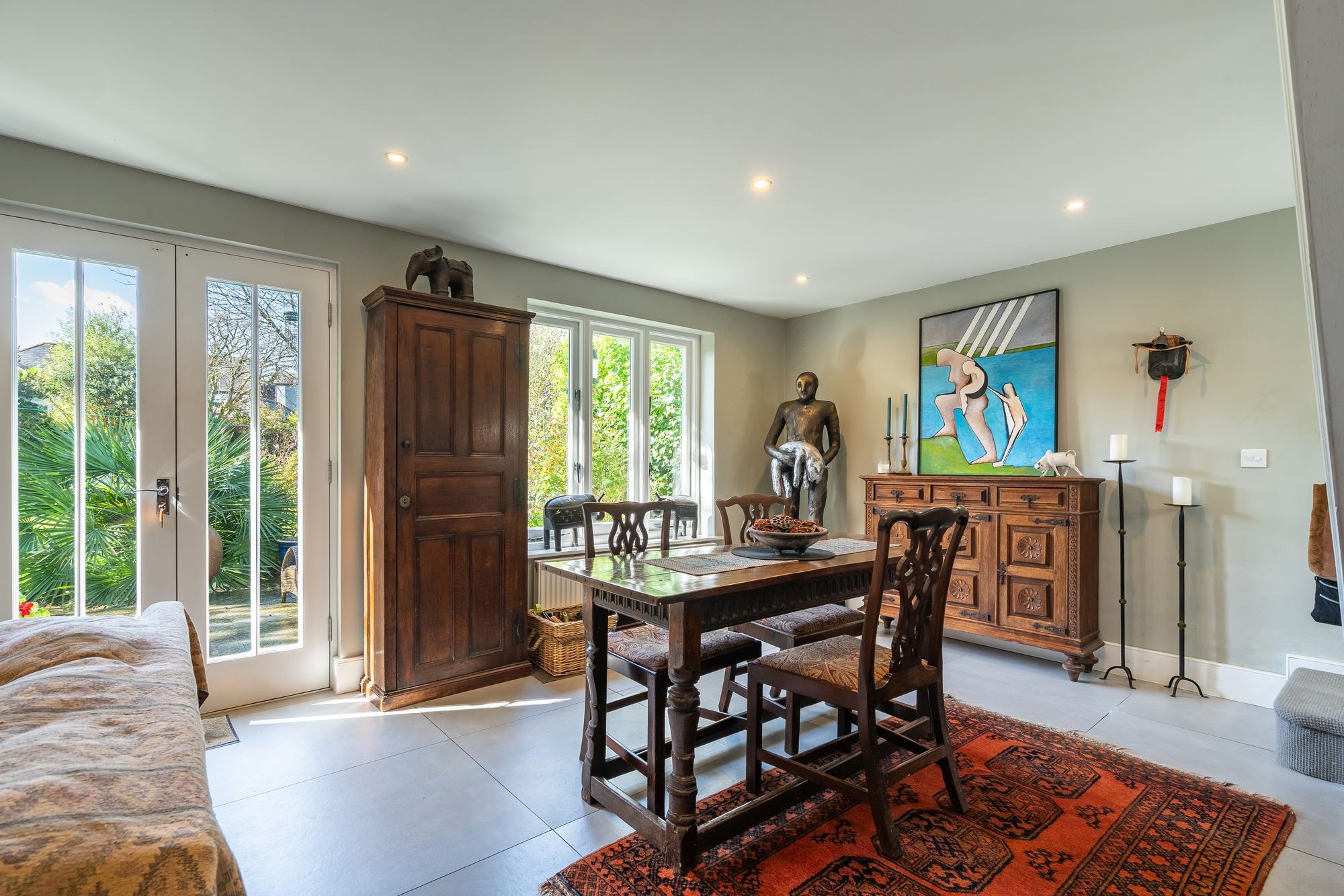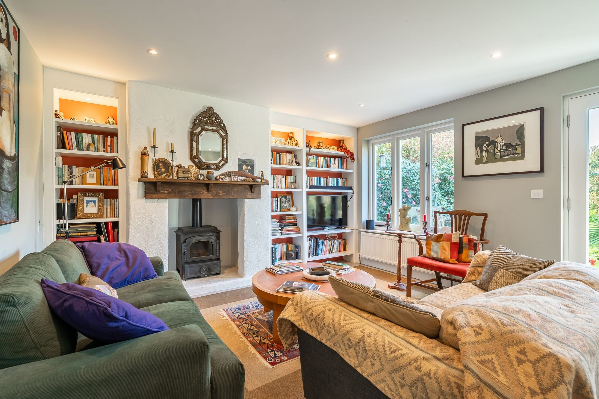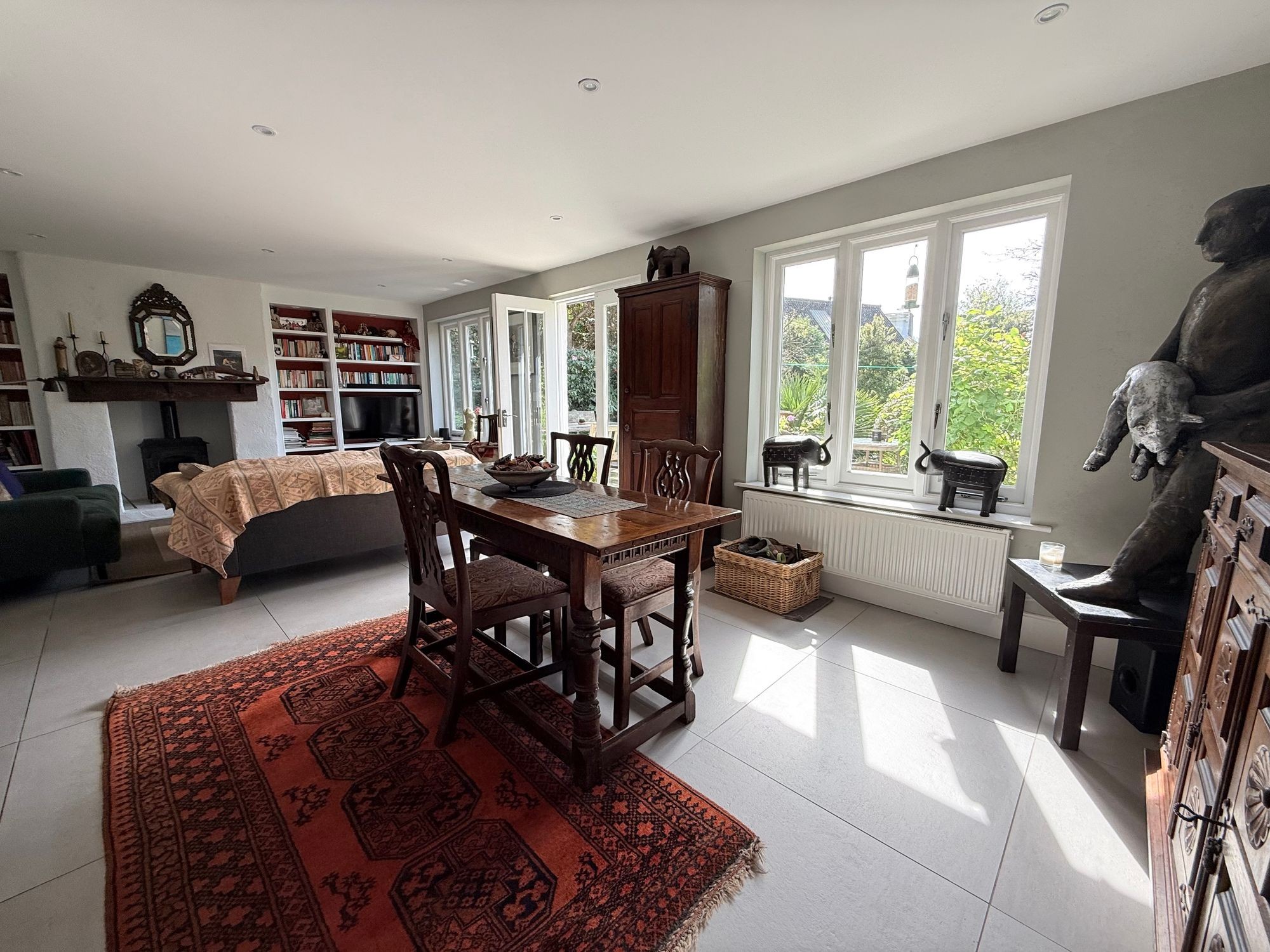 A glorious room, facing South and West overlooking the garden via two double glazed painted hard wood windows and via double glazed French doors leading out onto the terrace and garden. Continuation of porcelain tile flooring. Fireplace with inset oil-fired living coal flame fire, timber mantle. Recessed, spotlit book shelving beside. Two radiators. Turning staircase to first floor.