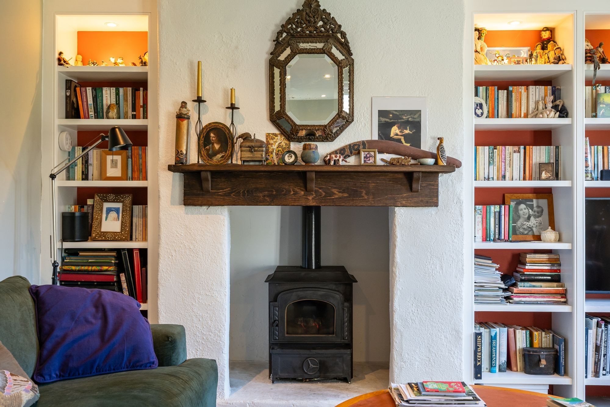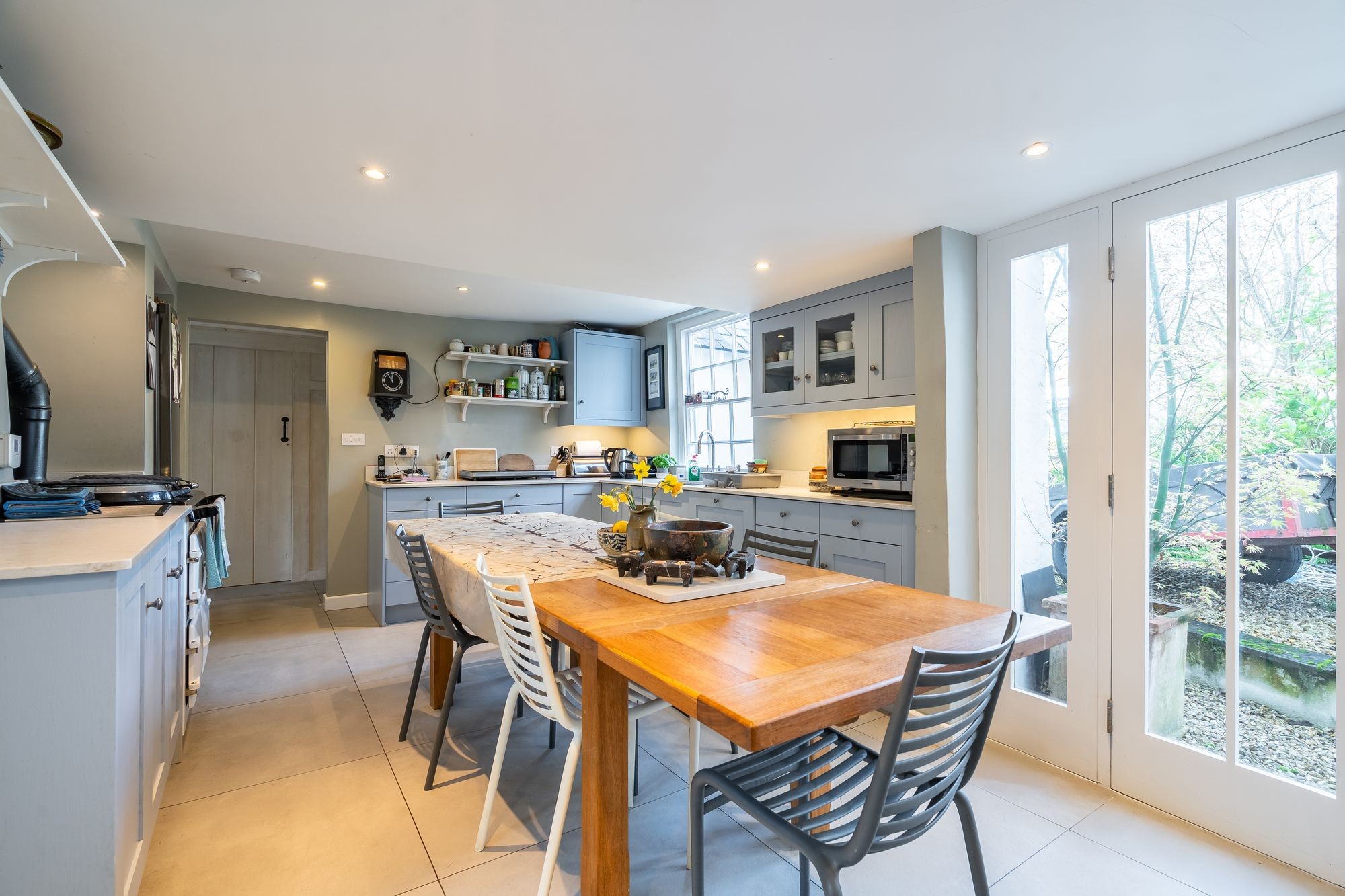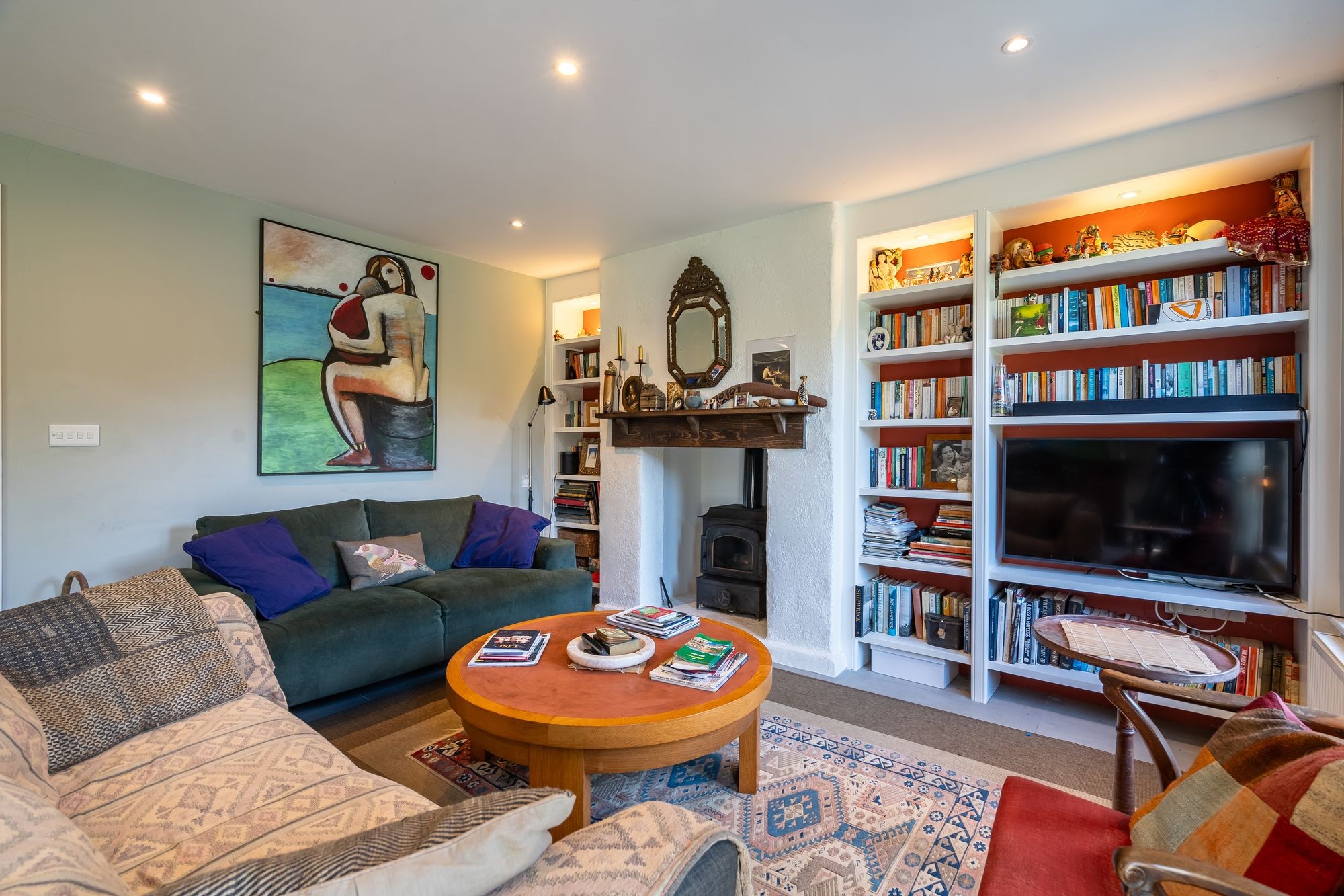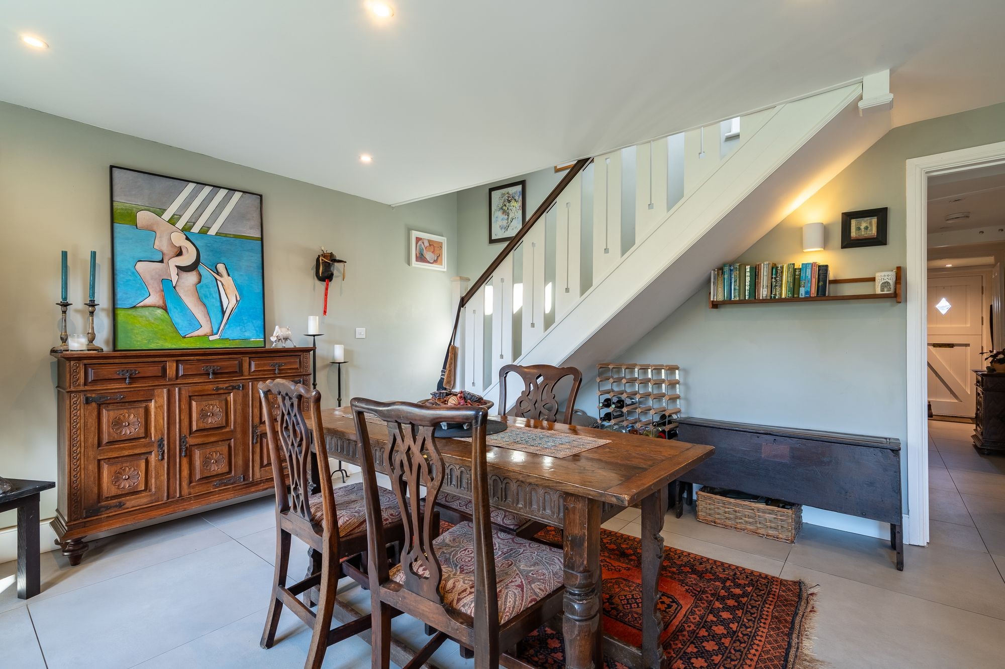 A glorious room, facing South and West overlooking the garden via two double glazed painted hard wood windows and via double glazed French doors leading out onto the terrace and garden. Continuation of porcelain tile flooring. Fireplace with inset oil-fired living coal flame fire, timber mantle. Recessed, spotlit book shelving beside. Two radiators. Turning staircase to first floor.
