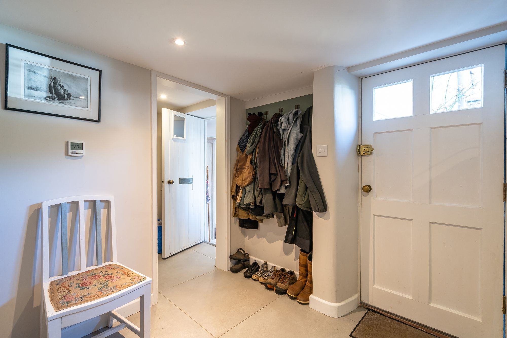 Porcelain tile floor, coat hooks, painted panelled door with old brass rim lock through to…..