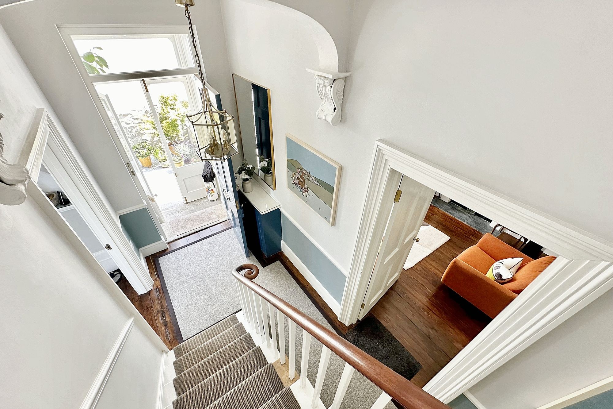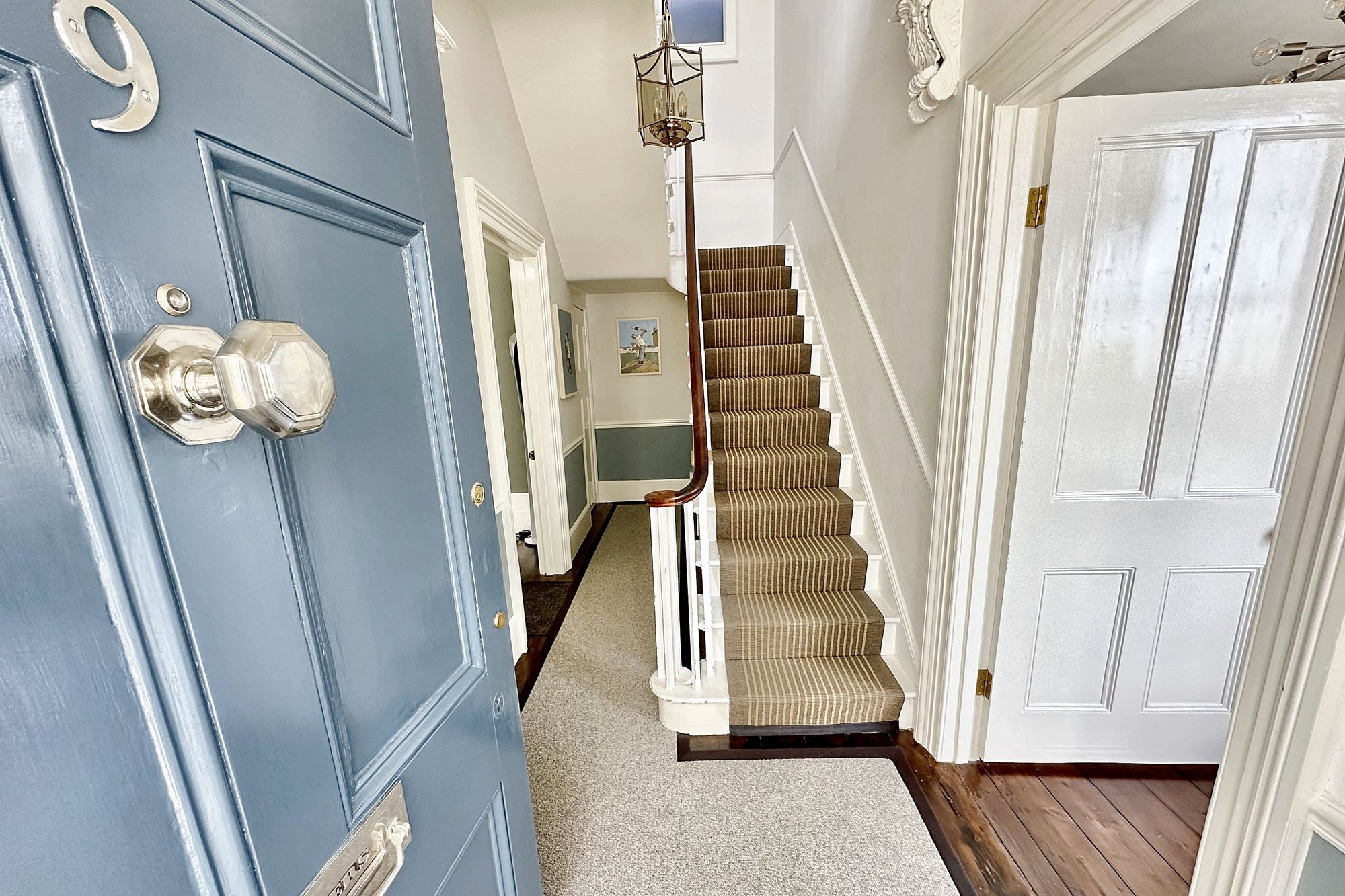 Stripped, stained and sealed floorboards. Cupboard housing the electric meter. Storage cupboard. Stairs to first floor. Wide painted panelled doors to kitchen and reception room.