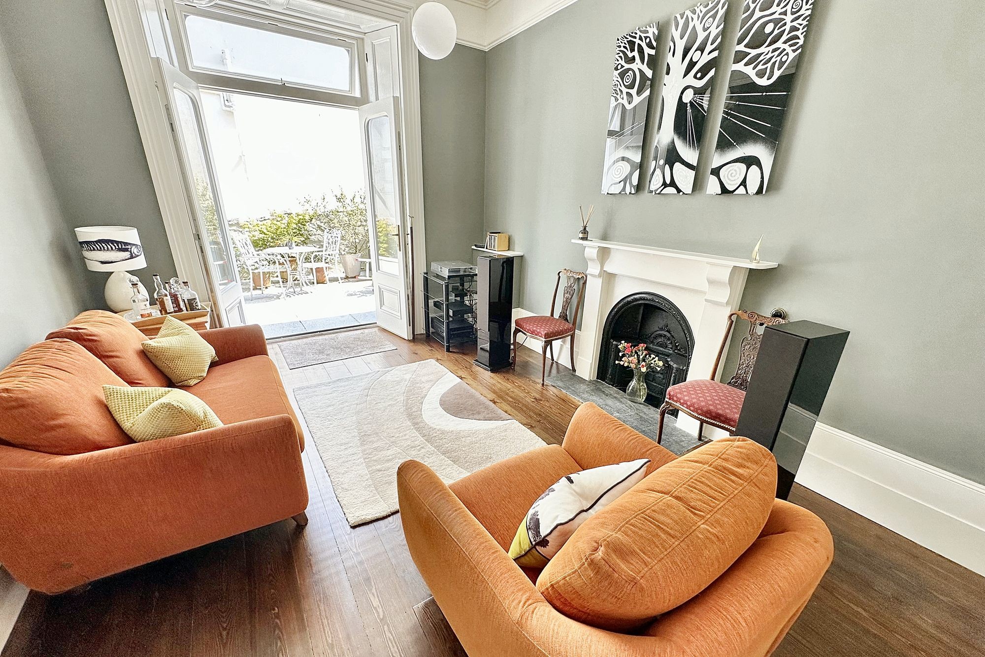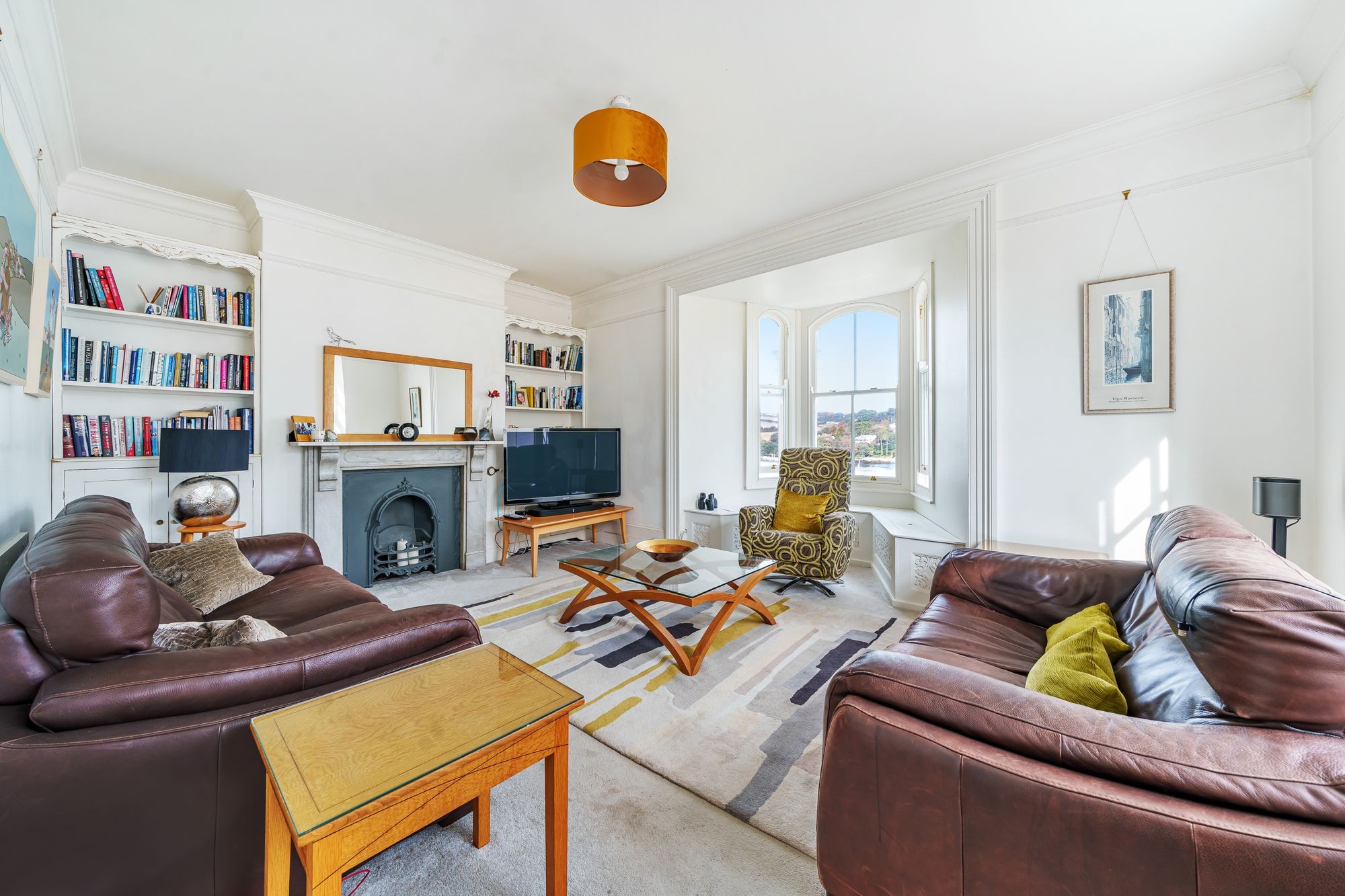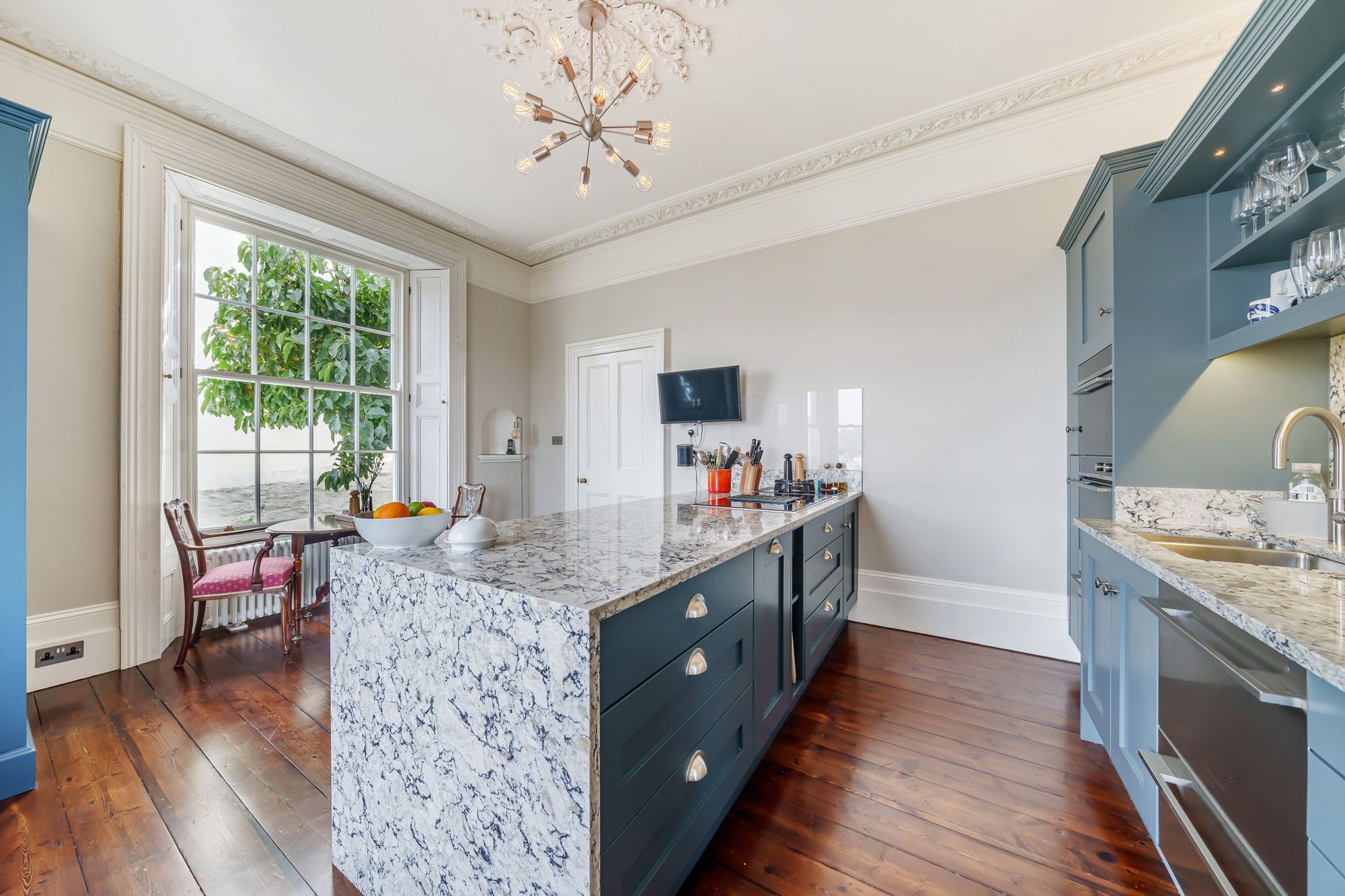 A fabulous room with high ceilings and original decorative cornicing and ceiling rose. Multipane sash window to side with wooden shutters and large bay sash window to front with windows seats, both windows enjoying great views overlooking the front terrace and garden and out across the water. Exposed wooden floorboards. Amazing 'Susie Hammond' kitchen with island peninsula, range of Farrow & Ball colour fronted cupboards, drawers and open shelving. Worktops and splashback are thick American quartz with inset one and a half bowl stainless sink and rivened drainer with 'Quooker' tap. Integrated 'Fisher & Paykel' appliances include chest height double oven, grill and microwave, dishwasher, fridge freezer. Neff electric induction hob and gas hob with extractor positioned on the island peninsula. Old school style radiator with under window seat panel radiators with remote programmable thermostatic controls