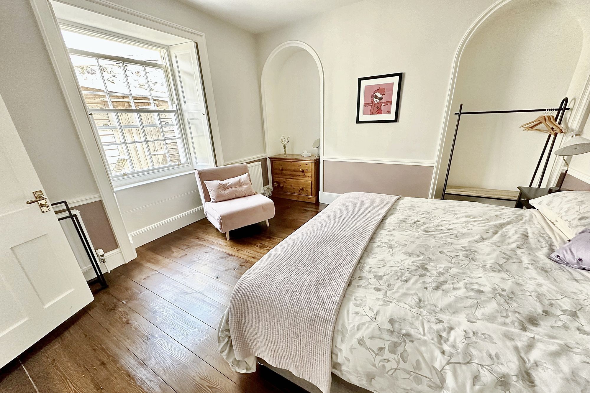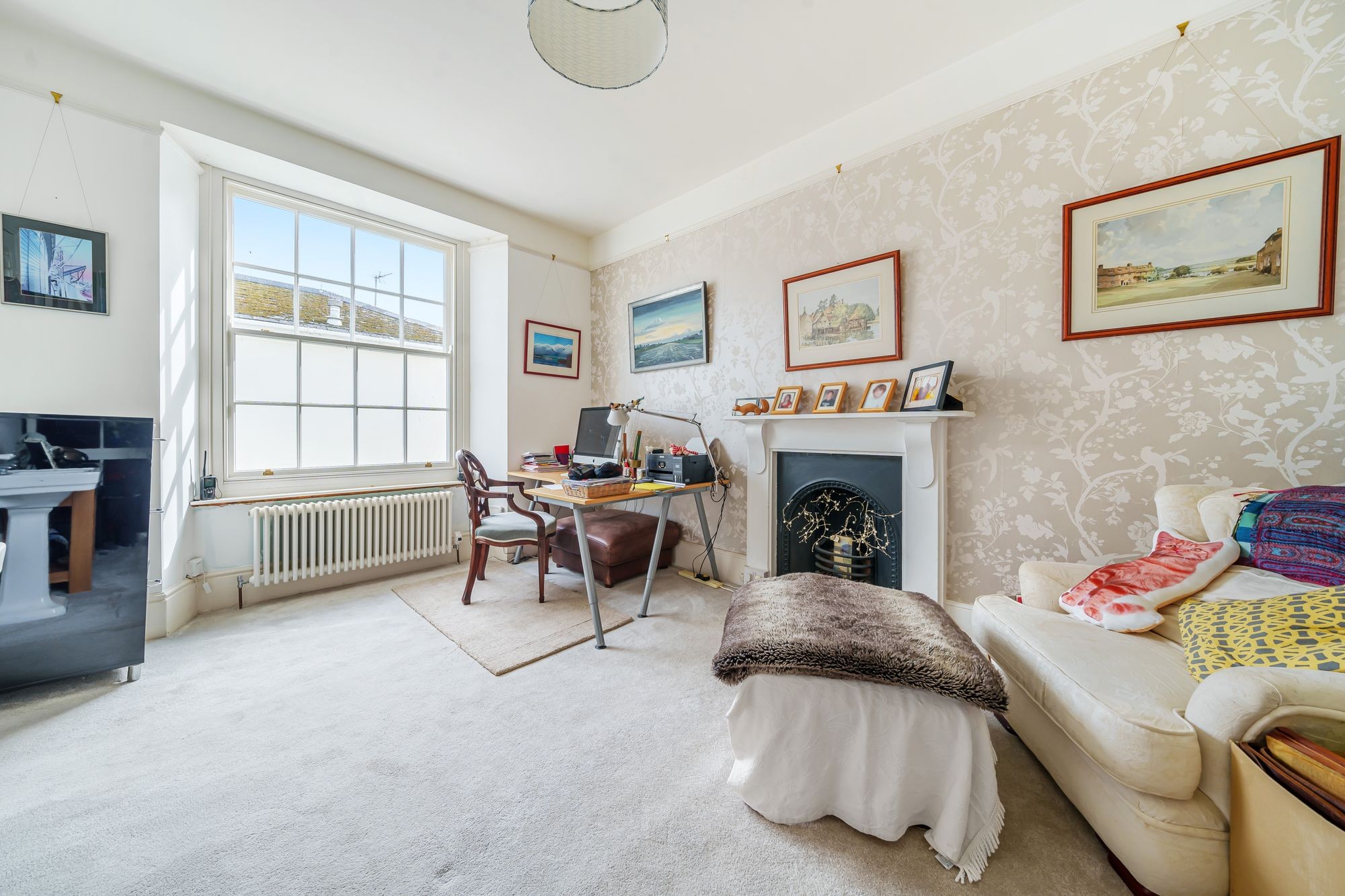 A truly uplifting room with arched triple bay sash windows with window seats and storage beneath and with the most spectacular, almost 180° views looking directly onto the river, to Trevissome, Flushing and surrounding country and coastline to the Carrick Roads, the Roseland Peninsula to St Mawes and St Anthony Head. A second sixteen-pane sash window to the side overlooks the harbour, estuary and coast. Period cast iron fireplace with marble surround and original servants’ bell pull beside. Cupboards and shelving in the side recesses. Original coving and picture rail. Old school-style radiator.