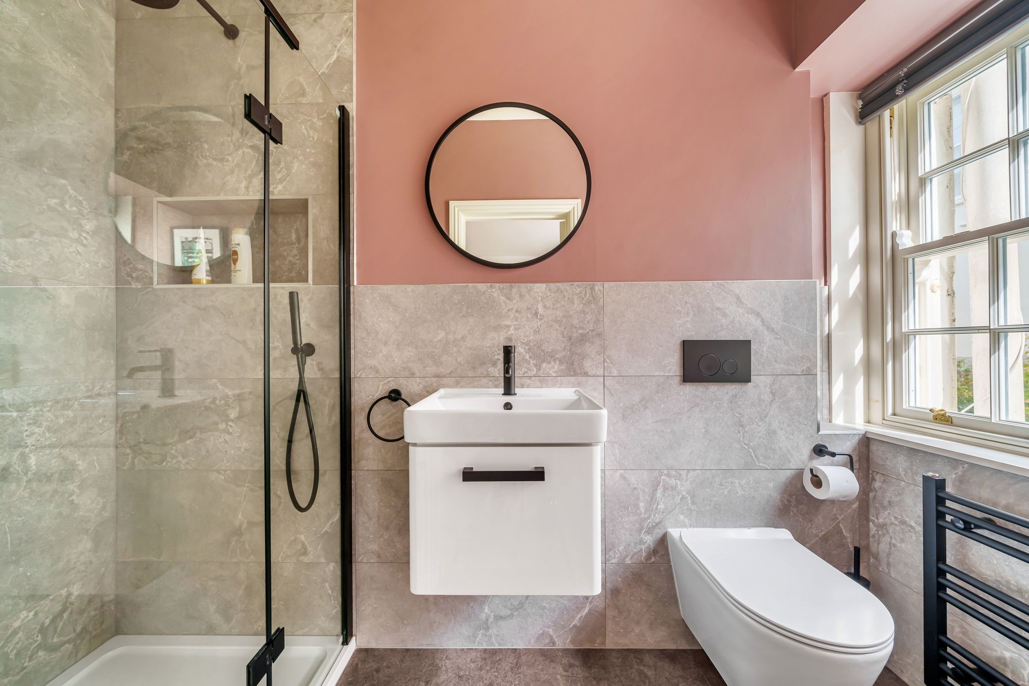 Sixteen pane sash window to side. Modern suite comprising WC with hidden cistern, wall mounted hand basin with cupboard beneath and shower cubicle with rainfall and flexible spray. Part wall tiling. Black chrome heated towel radiator.