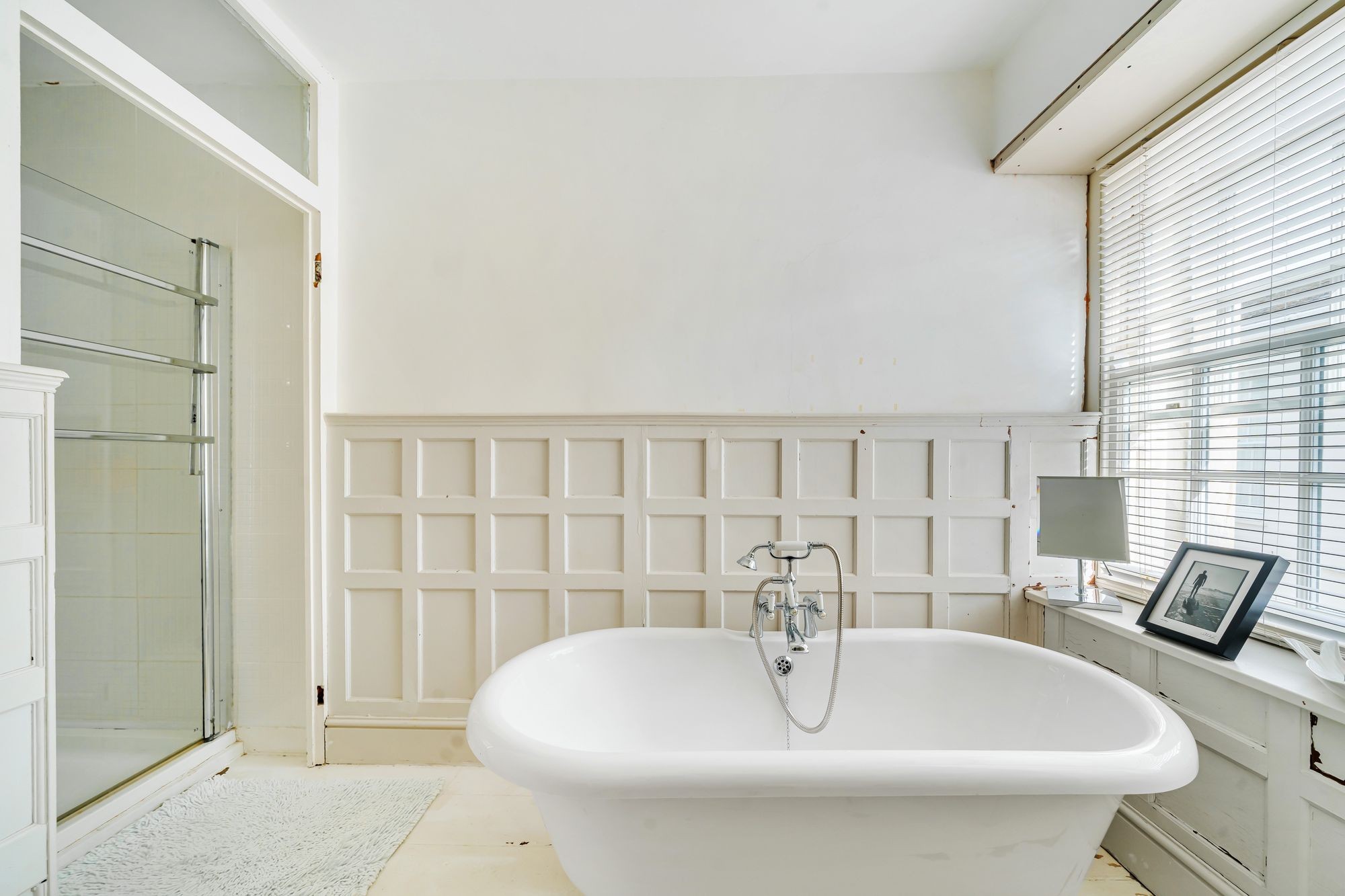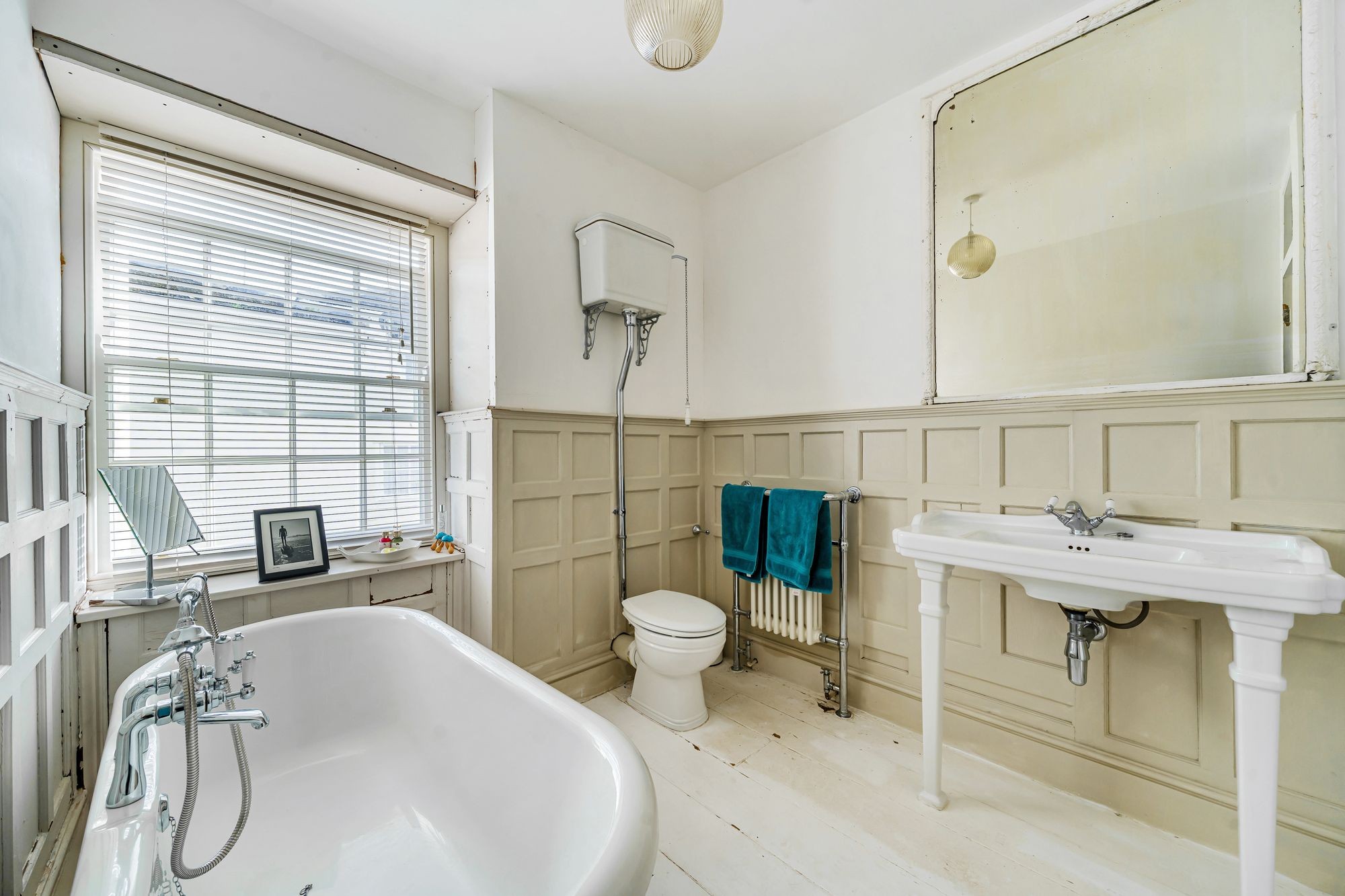 Sixteen pane sash window to side. Exposed, painted floorboards. Part wall panelling. Stand alone, roll top, claw foot bath with central tap and shower attachement, high level flush WC, double porcelain sink and tiled shower cubicle. Heated towel radiator.
