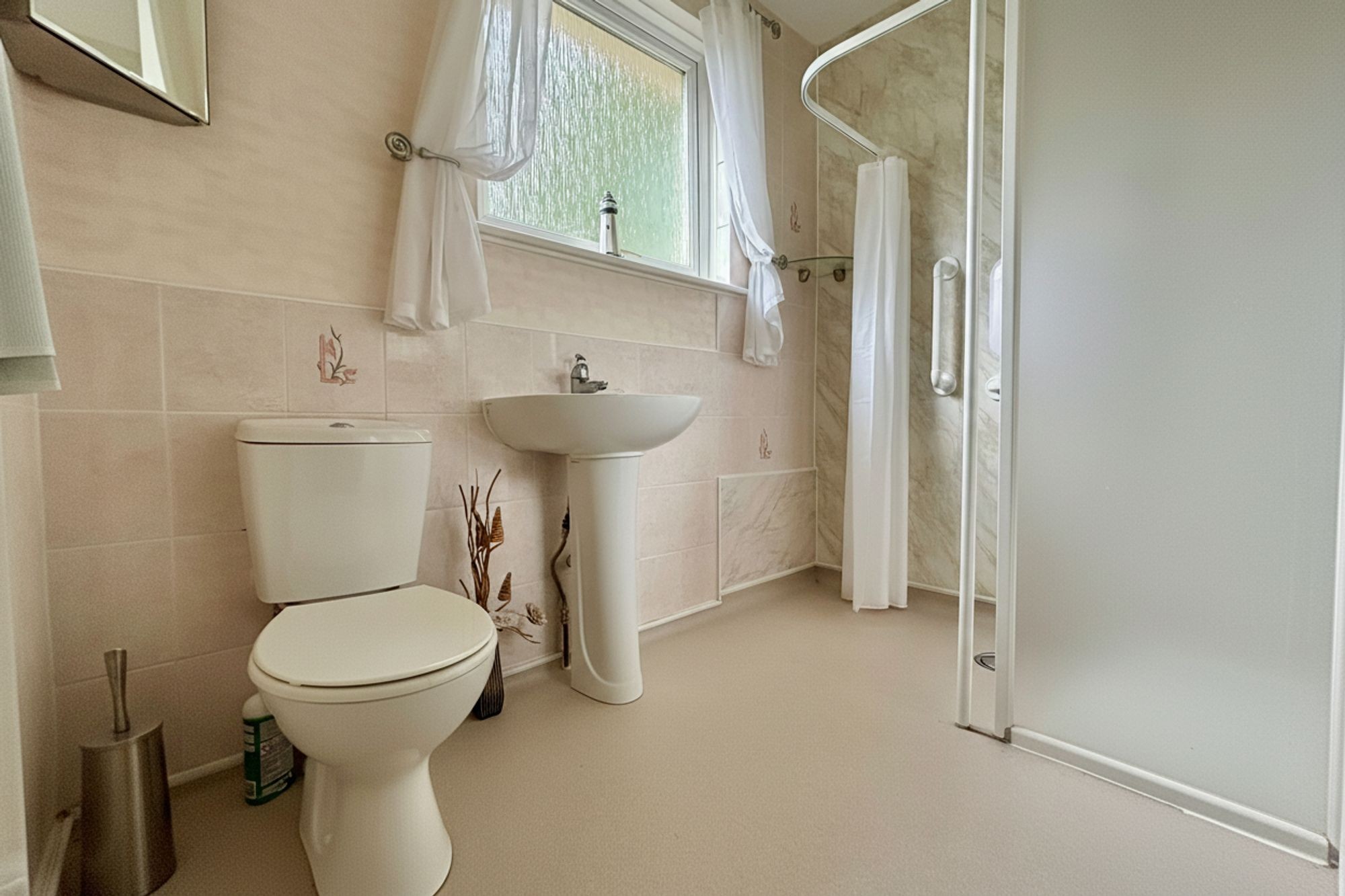 Currently designed as a wet room with shower, WC and pedestal hand basin. Obscure window to rear. Partial wall tiling and easy clean surface to shower area. Radiator.