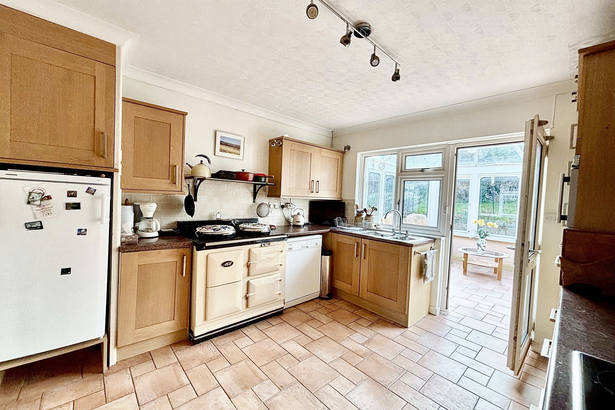Almost square room with units on three sides with light wood door and drawer fronts complemented by many feet of useable dark work surface. There is a lovely cream coloured Aga, plus a high-level oven and grill. Victorian tile splashback. Terracotta tiled flooring that leads through to the ...