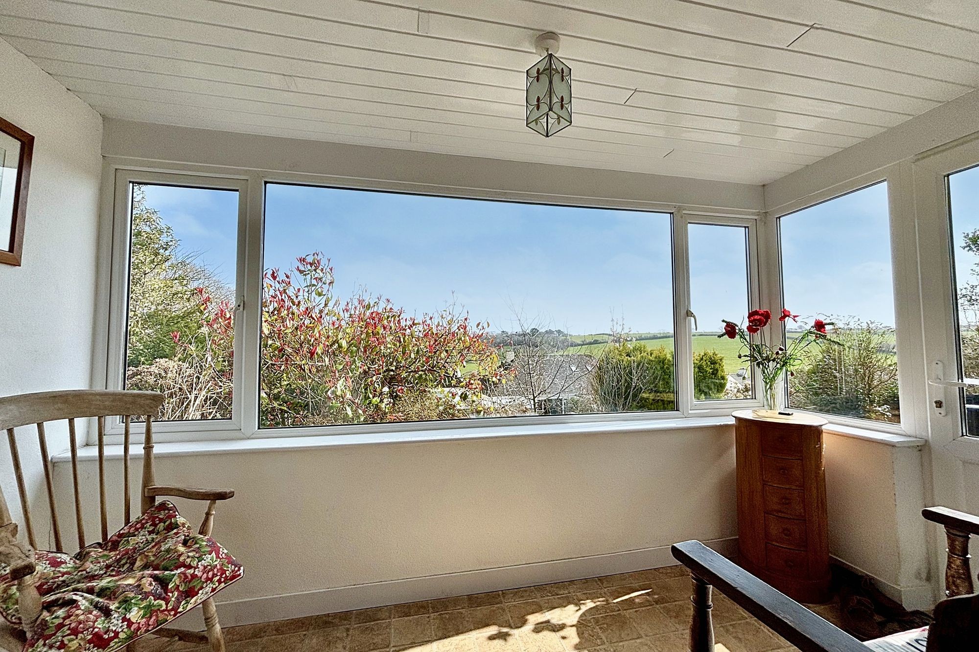 Fully glazed from a knee-high wall, doors to the left and right that access the garden and patios.