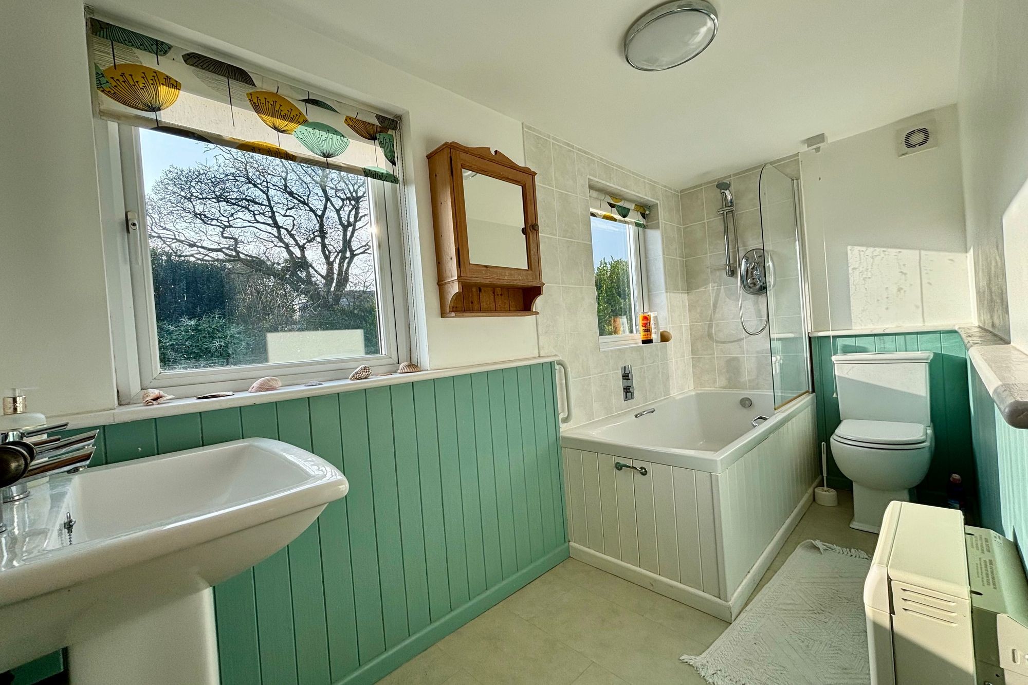 White suite comprising a bath with electric shower over and glass screen to the side. Low level flush W/C and hand wash basin. Half panelled walls and tiled wet areas. Two windows to the rear. Extractor. Radiator