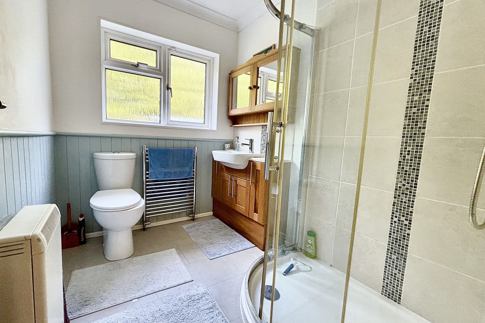 Corner shower cubicle with sliding doors, plumbed shower with rainfall head and hand attachment. Low level flush W/C, hand basin on vanity unit, half panelled walls and tiled wet areas. Obscure window to side elevation. Chrome ladder style heated towel radiator.