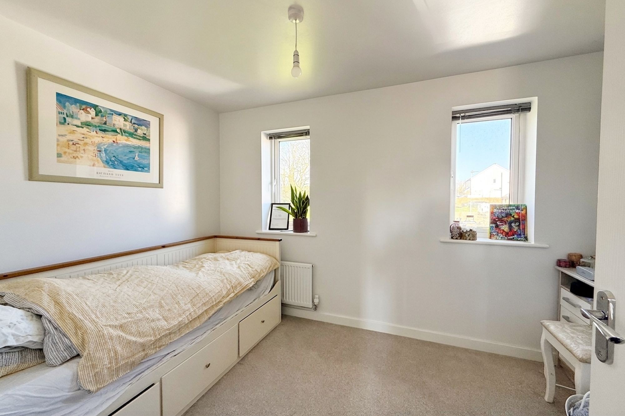 Another bright and double sized bedroom with two windows to the front aspect enjoying a pleasant outlook to fields and open green space opposite. Panel door to an over stair's storage cupboard. Radiator.