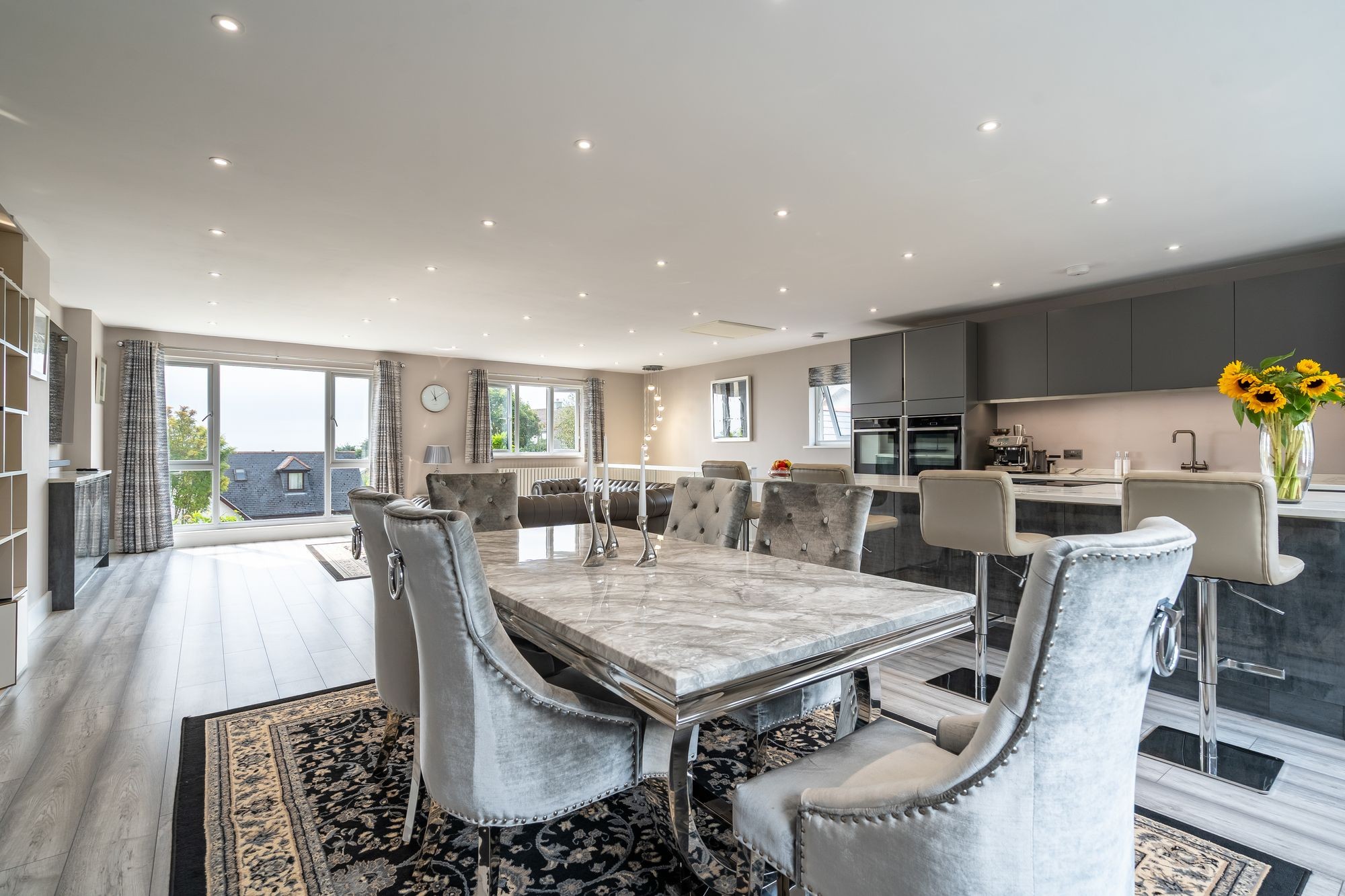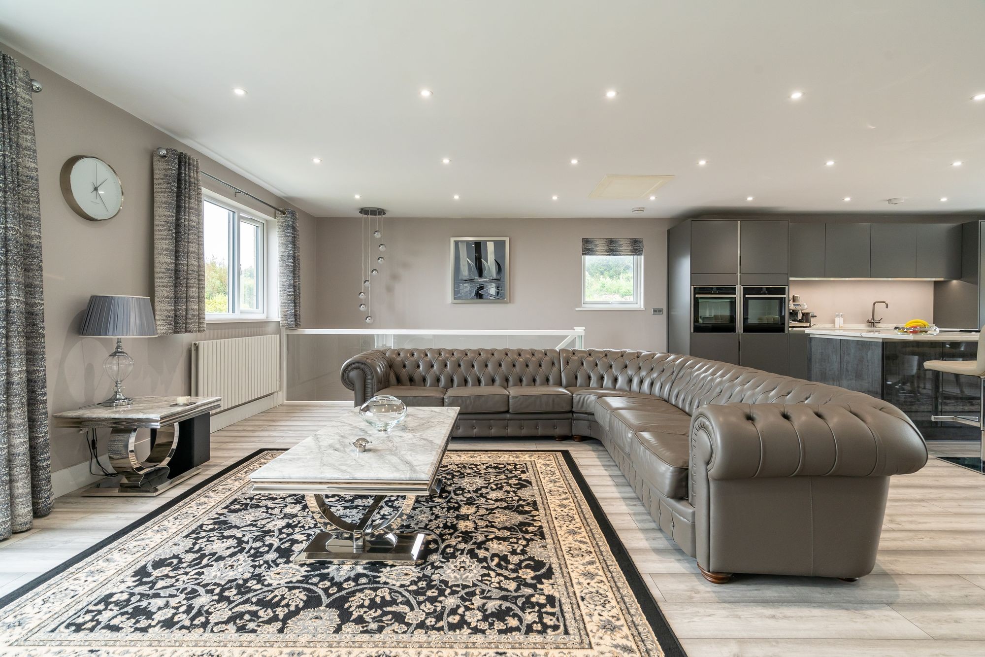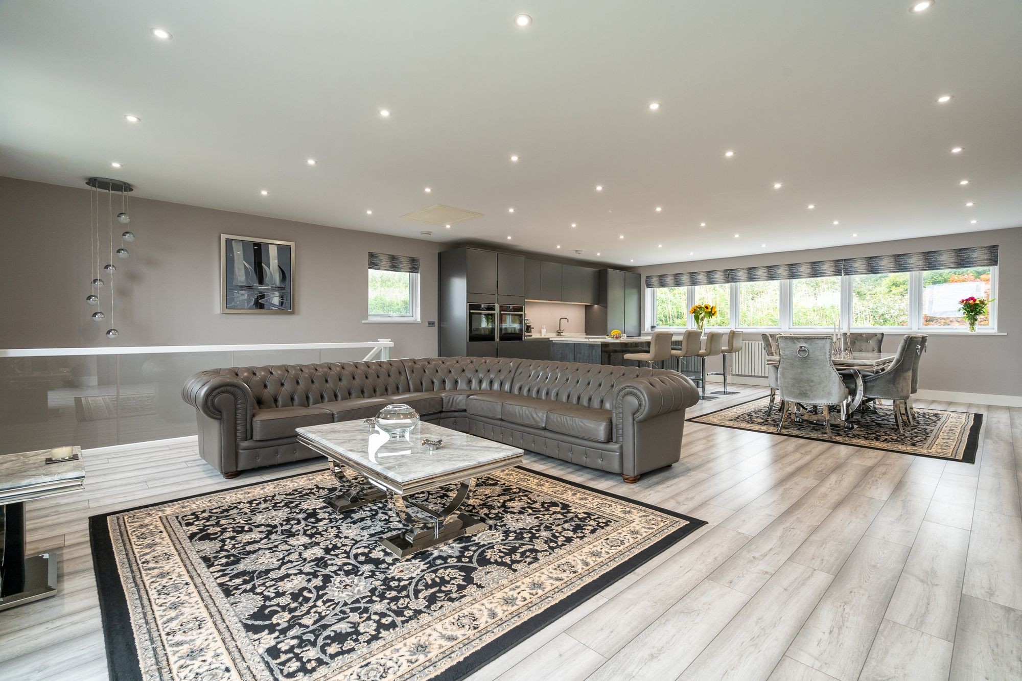 Totally open -plan and almost 800² ft in size, this amazing space has defined areas of seating, dining and kitchen. The kitchen is amazing, Neff and Smeg built-in appliances plus a 3m x 1.2m island with beautiful white quartz worktop. To the rear is an almost full width of windows with views over the rear garden and to the front there is a large window with far reaching sea and countryside views. A further window to the side means this large room is flooded with natural light.