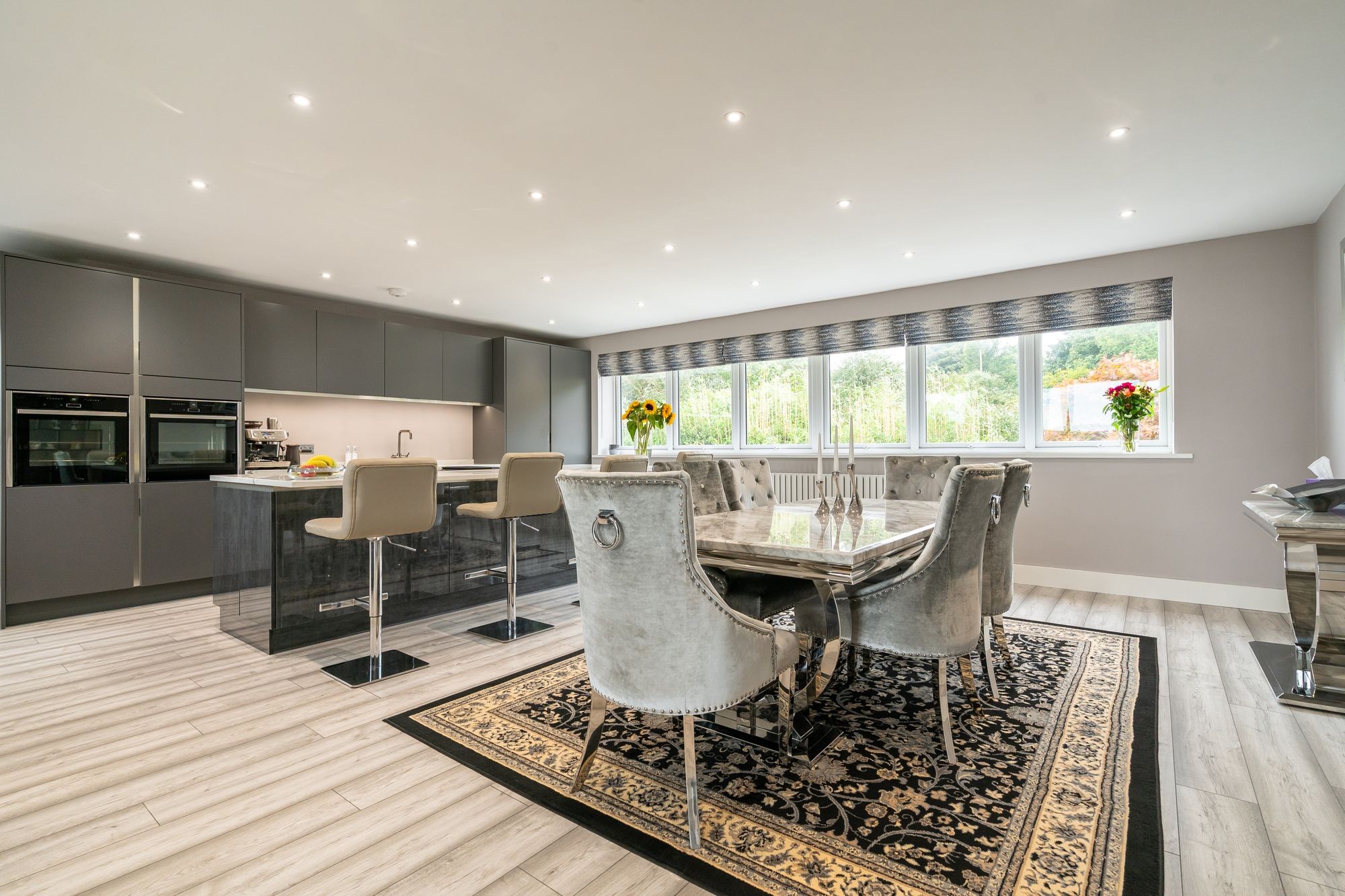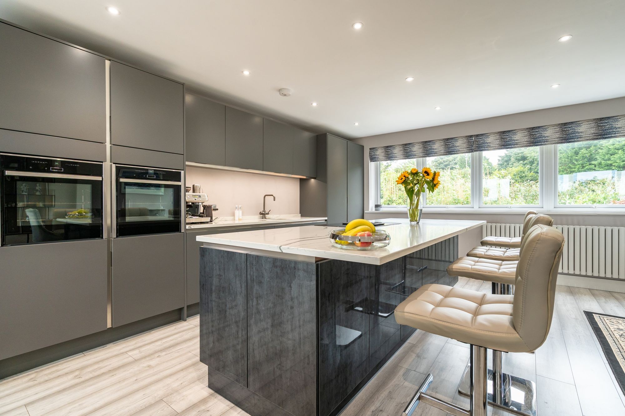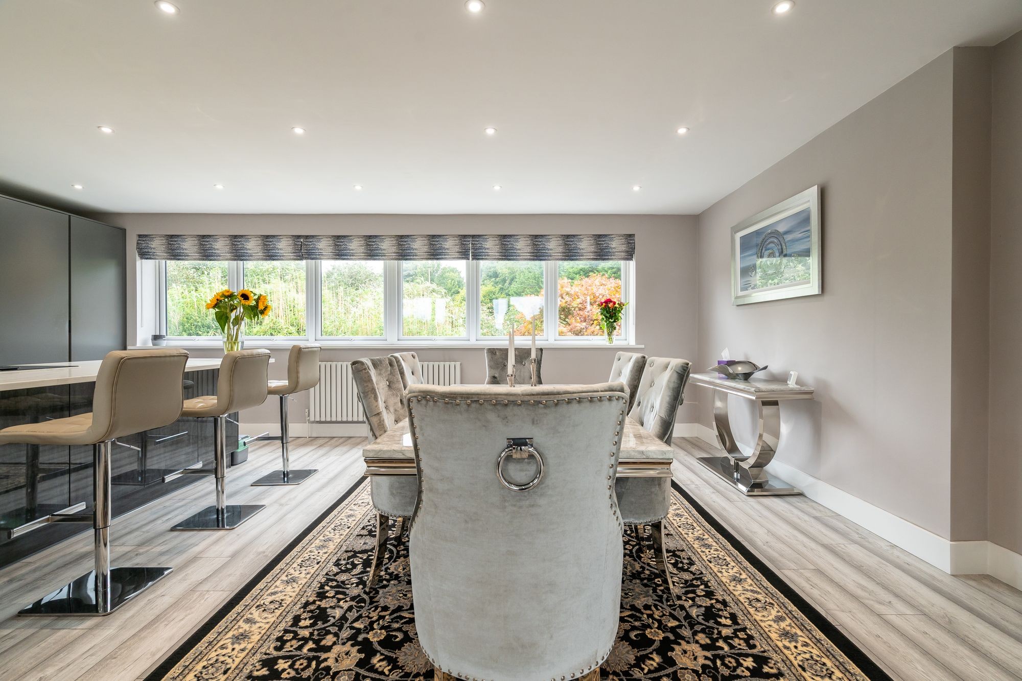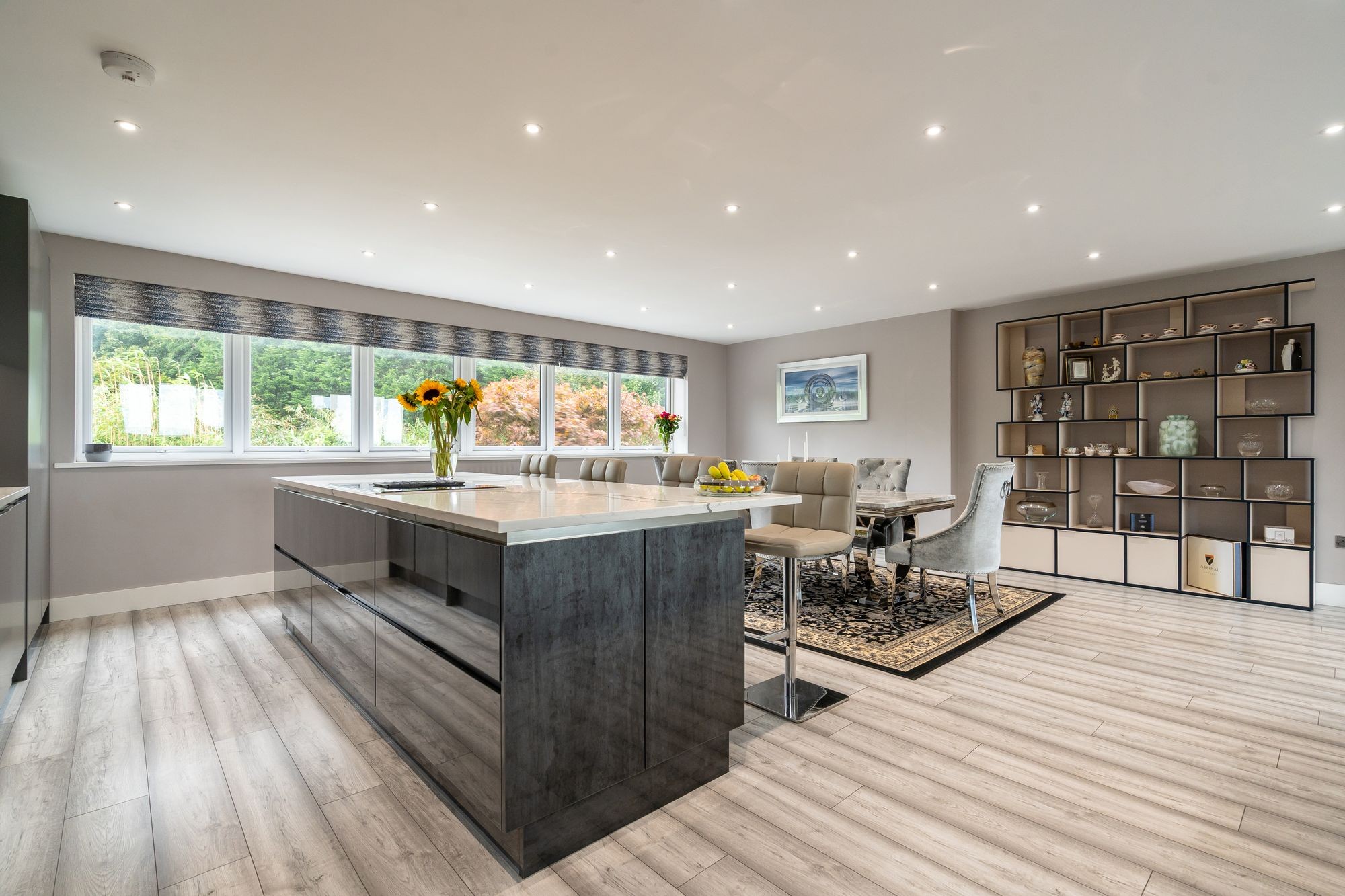 Totally open -plan and almost 800² ft in size, this amazing space has defined areas of seating, dining and kitchen. The kitchen is amazing, Neff and Smeg built-in appliances plus a 3m x 1.2m island with beautiful white quartz worktop. To the rear is an almost full width of windows with views over the rear garden and to the front there is a large window with far reaching sea and countryside views. A further window to the side means this large room is flooded with natural light.