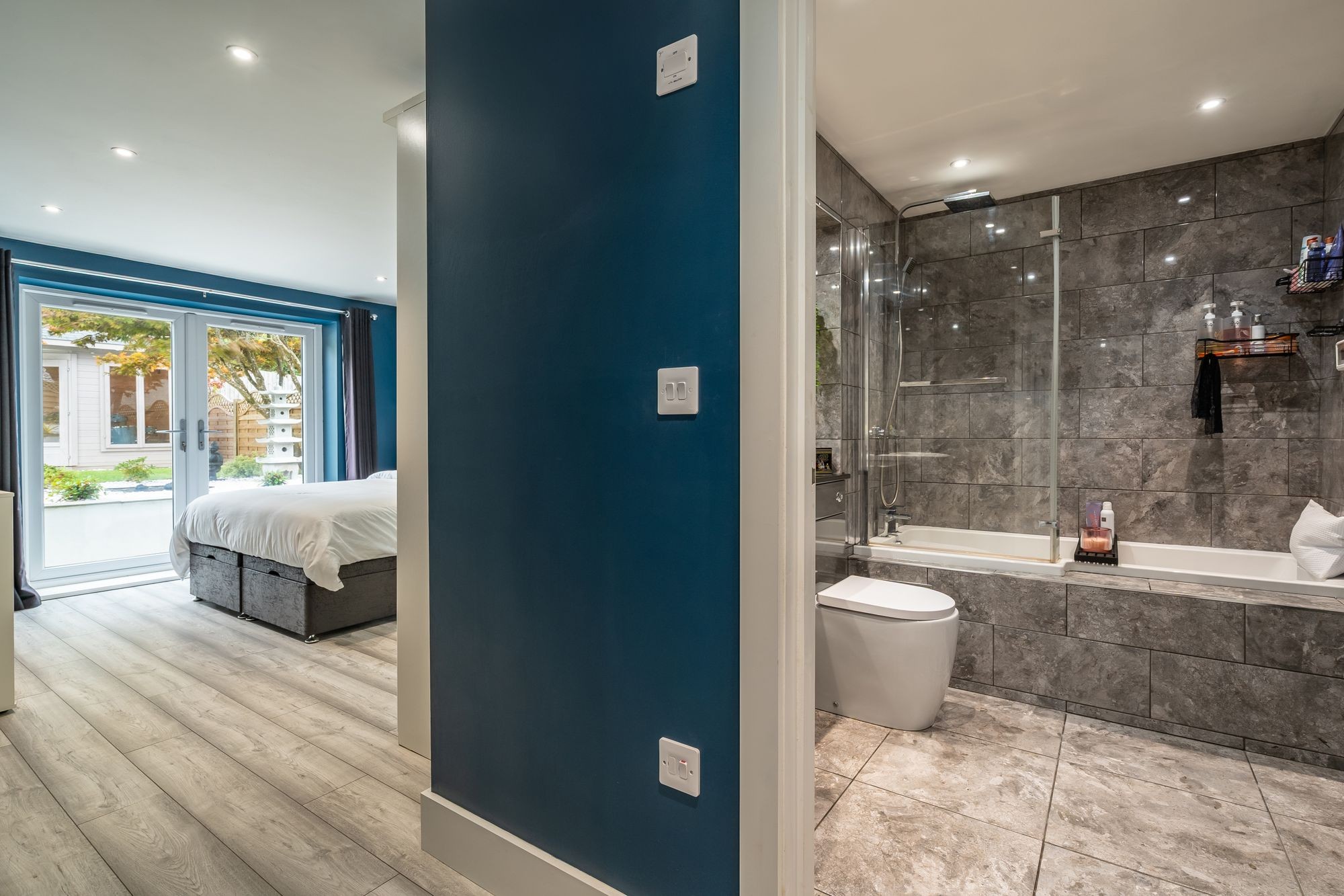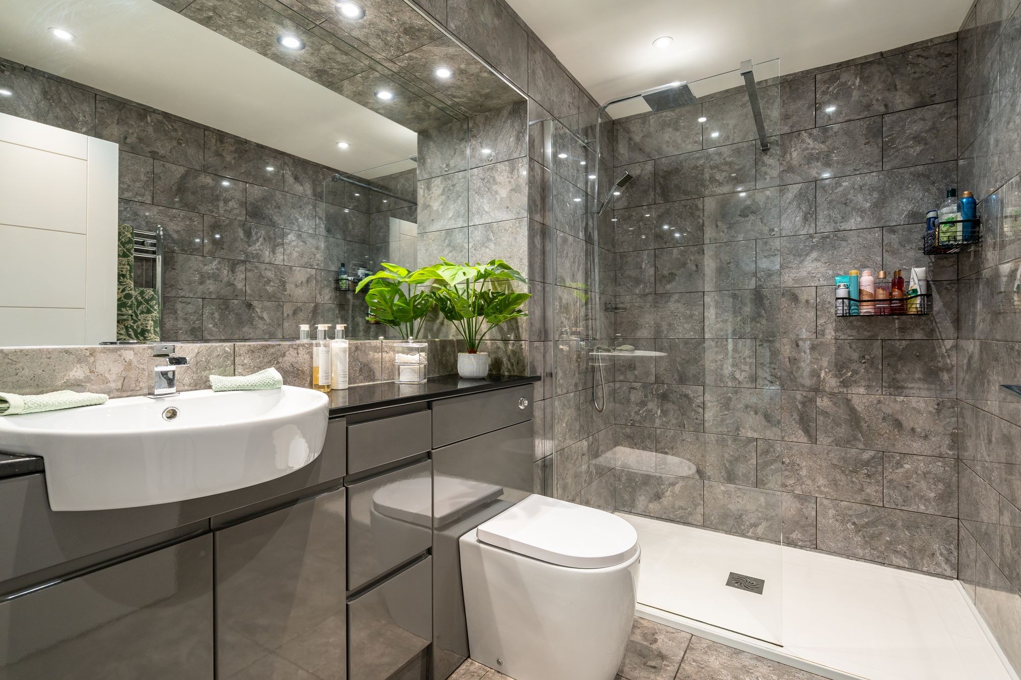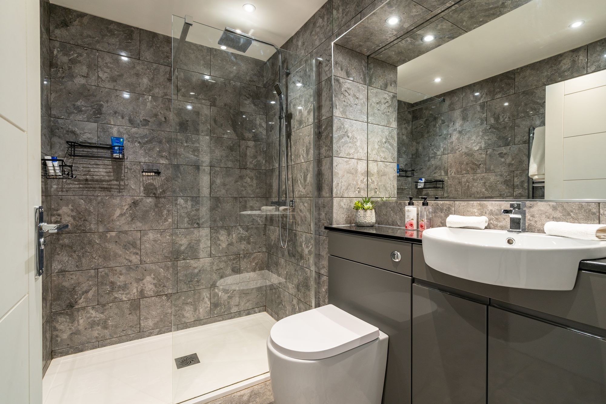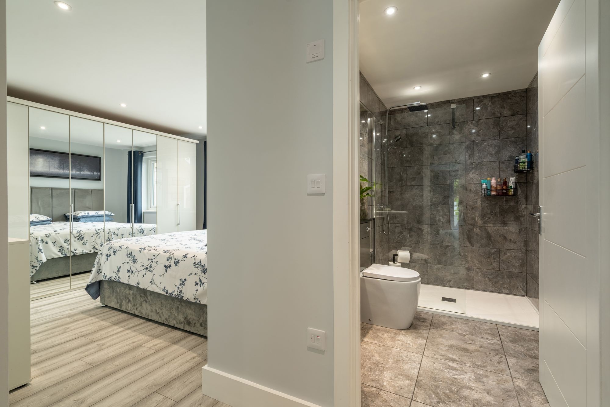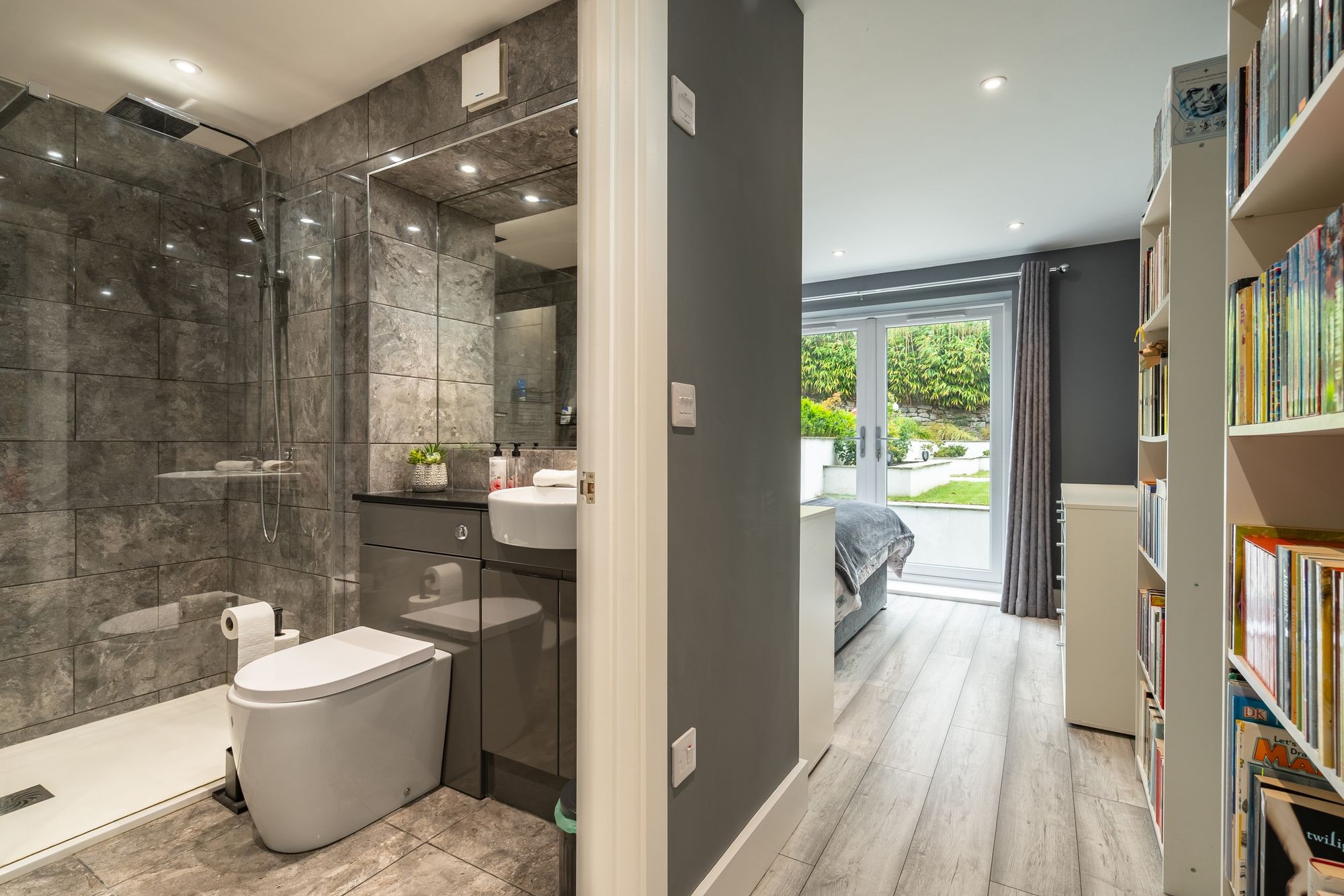 Large walk-in shower cubicle with glazed screen, rainfall head and spray attachment. WC, wash basin on vanity unit and tiling to the same quality as that in bedroom one.