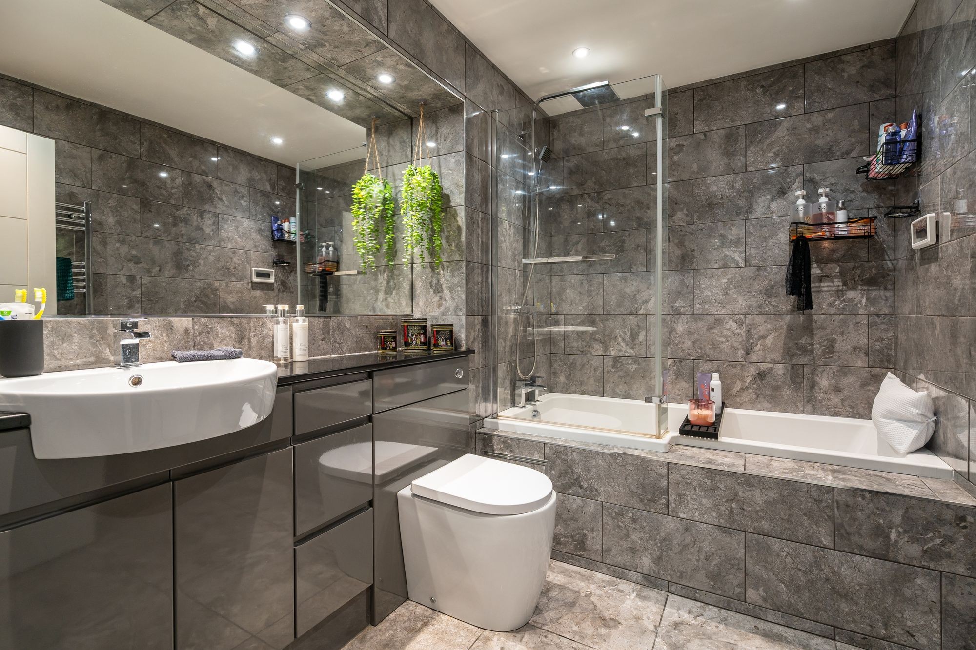 Lovely presentation with a modern white suite comprising "P" shaped bath with shower over and glass screen to the side, W/C and hand basin on vanity unit. Large mirror. Fully tiled walls.