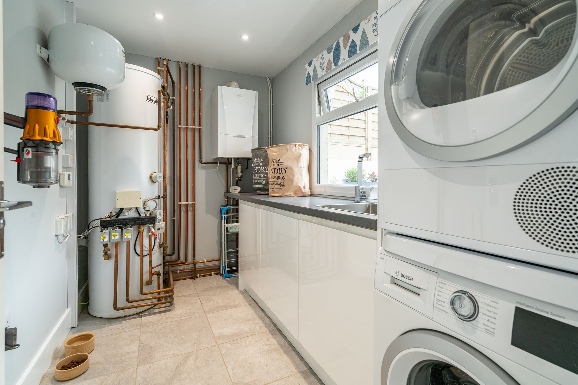 Window overlooking the rear garden. Sink unit plus space and plumbing for washing machine and tumble dryer. Gas fired boiler fuelling radiator central heating. Modern pressurised hot water tank.